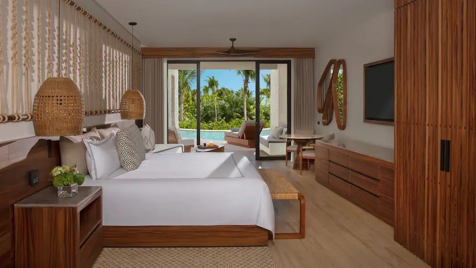 Delight in direct swim-out access from this 684-square-foot suite featuring one king bed, a private terrace with direct swim out access and pool and tropical garden views.