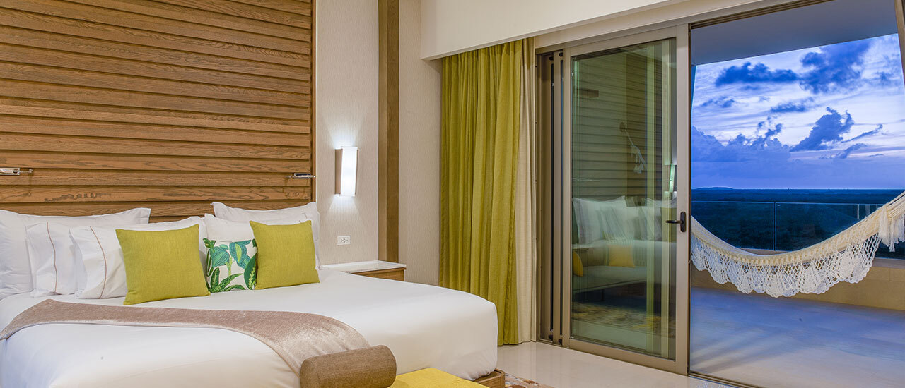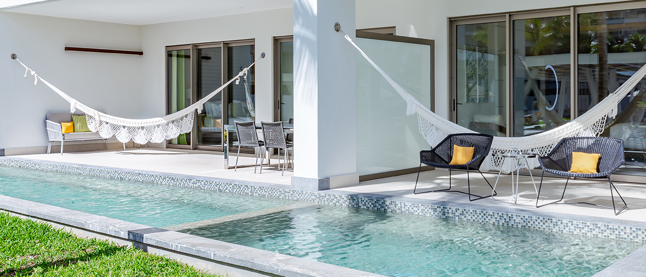 The expansive 1,276 sq. ft. one-bedroom swim up suite offers stylish accommodation with designer furniture using a palette of earthy tones with accents of jungle mangrove green. Boasting a spacious bedroom, fully equipped kitchen, 2 full bathrooms, living room, and a private terrace with a hammock and dipping pool right outside your door.