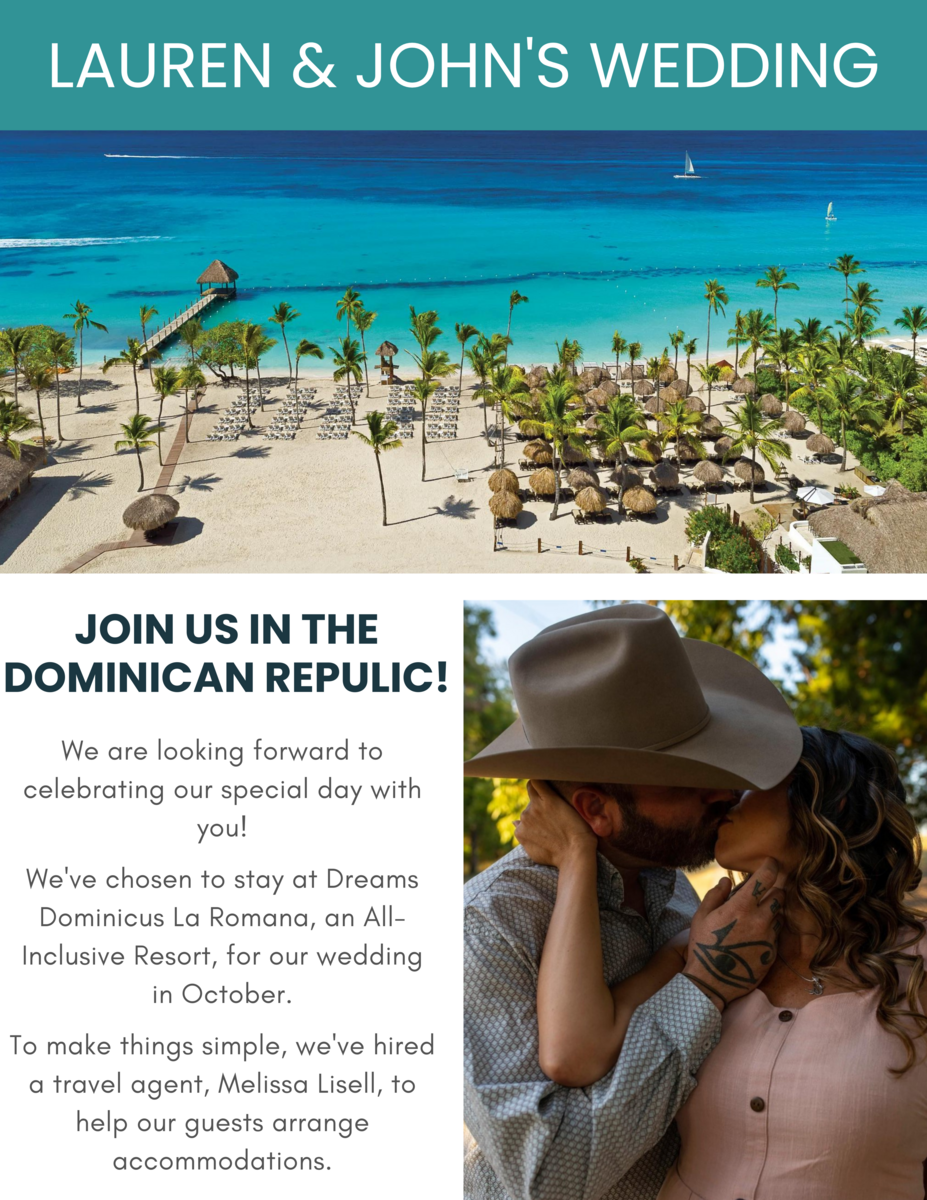 It is recommended that you arrive by Tuesday, October 10, 2023. Arriving on the resort a few days prior to Lauren & John's wedding gives you a time cushion for potential flight cancellations and delays or luggage delays.