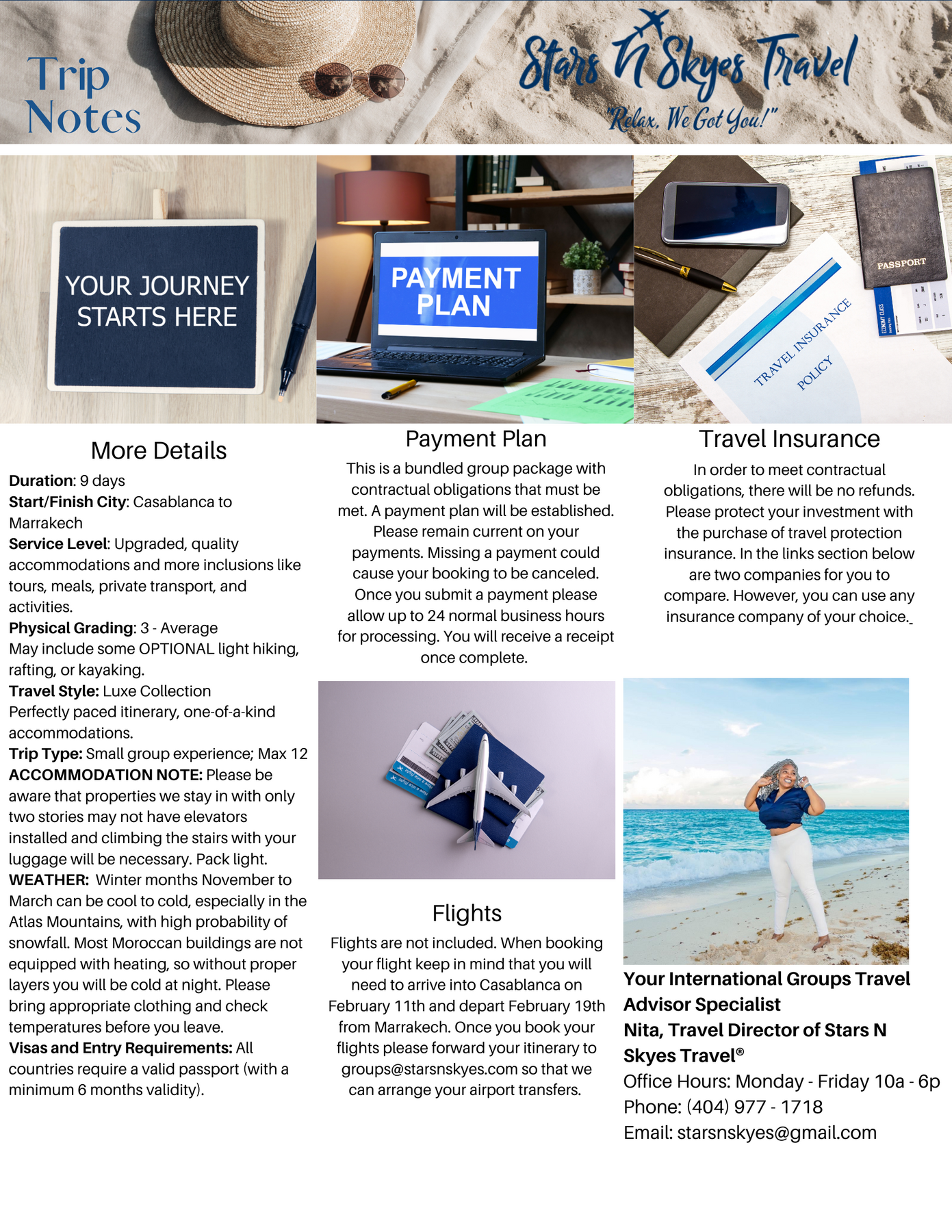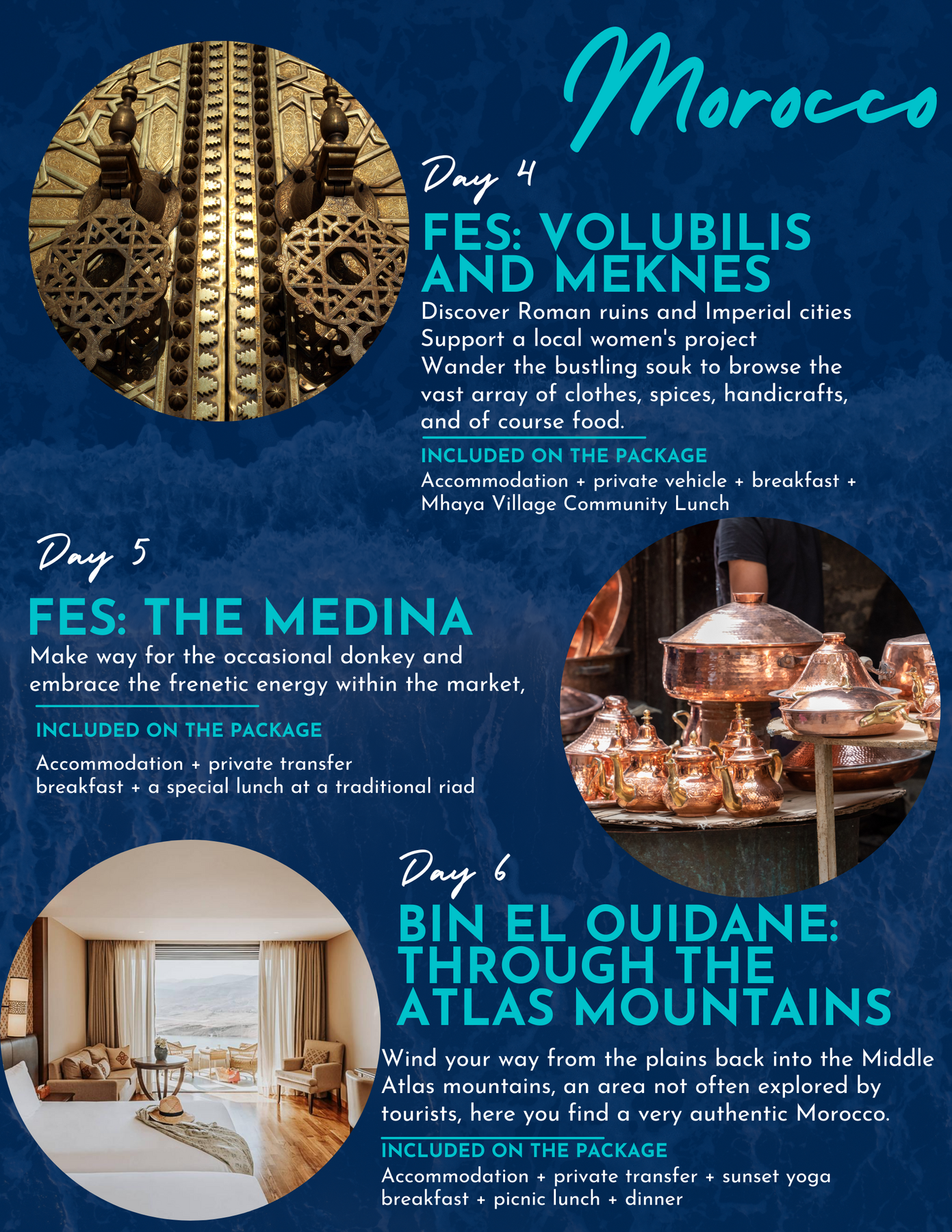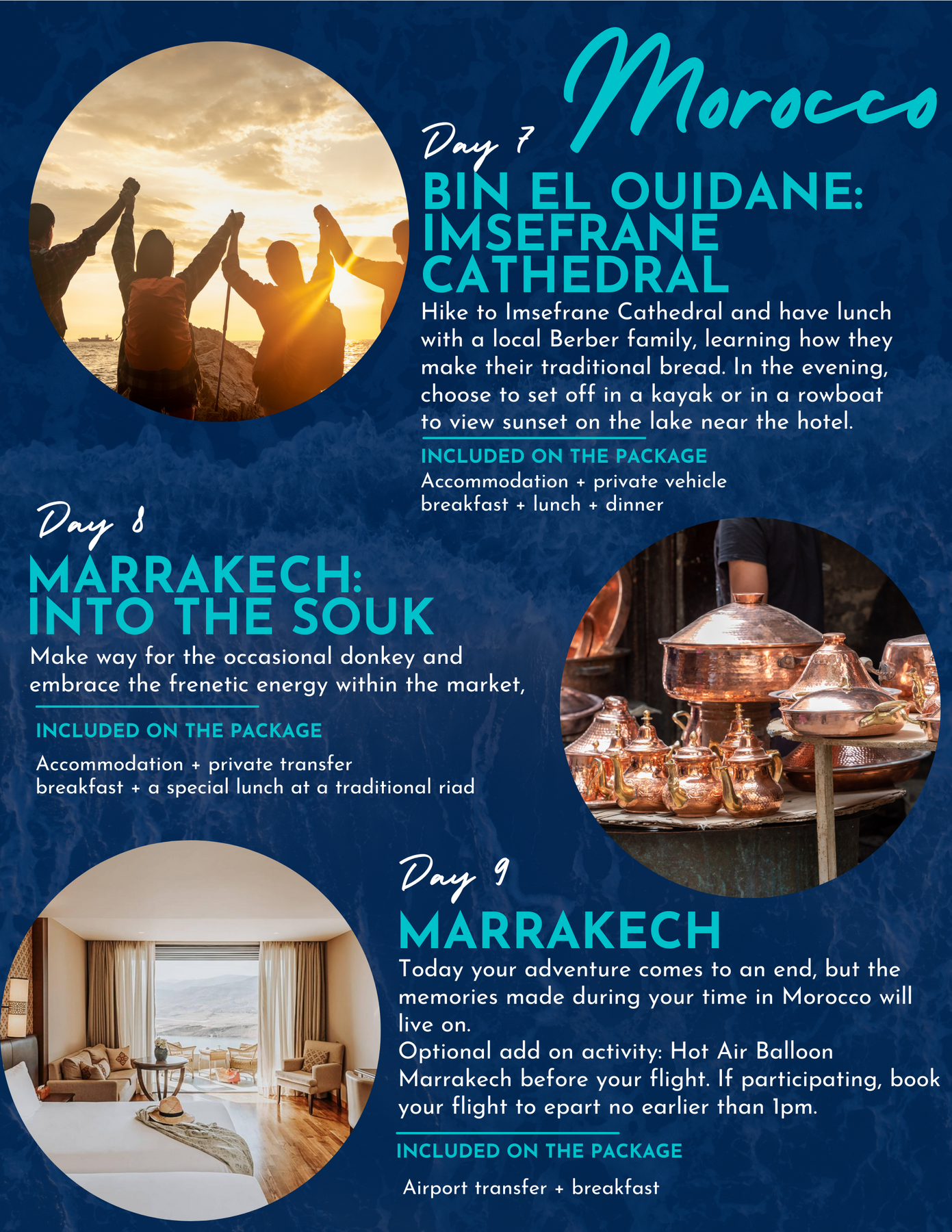 *Please note if you purchase the Marrakech Hot Air Balloon ride on the final day of your tour you will not finish until 10am. We recommend booking your departing flight no earlier than 1pm to ensure you have enough time to make it to the airport.