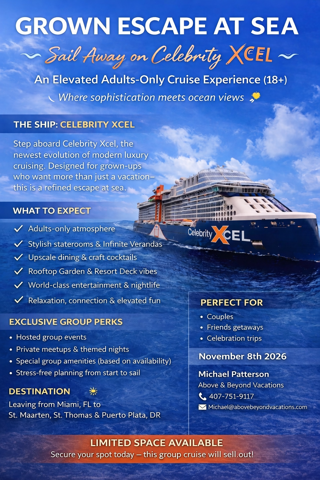 Get ready to step into a refined, stress-free escape designed exclusively for adults who want more than an ordinary cruise. Grown Escape at Sea is a hosted group sailing aboard the stunning Celebrity Xcel, where modern luxury, vibrant destinations, and unforgettable connections come together.