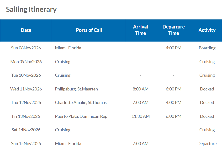 Ports of Call: St. Maarten • St. Thomas • Puerto Plata, DR