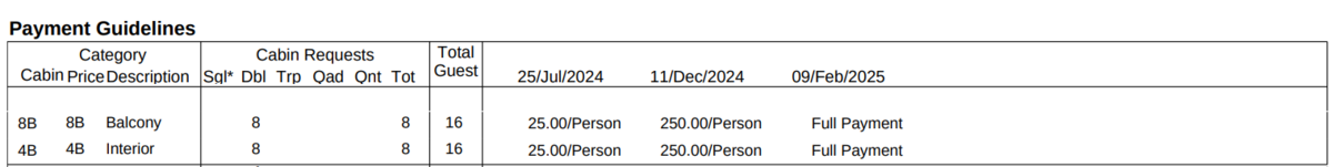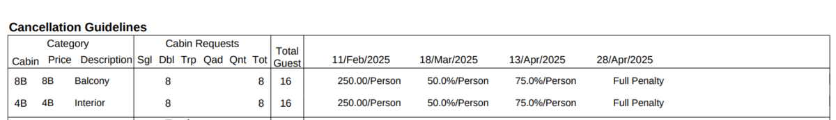 Cancellation charges for all l bookings will be assessed as listed below. Guests who have made reservations for multiple occupancy cabins (for example for three, four, or five persons) are subject to the cancellation charges and schedule below for the entire cabin reservation, even if Guest does not cancel his or her individual reservation and even if the names of all persons to be in the same cabin as Guest are not provided at the time of booking. Guests whose embarkation is denied under Section 2(g) above (related to background checks and conduct) are also subject to the cancellation schedule below as are Guests who have made bookings as part of the same travelling party as a Guest who is denied embarkation, as set forth under Section 2(g) above.