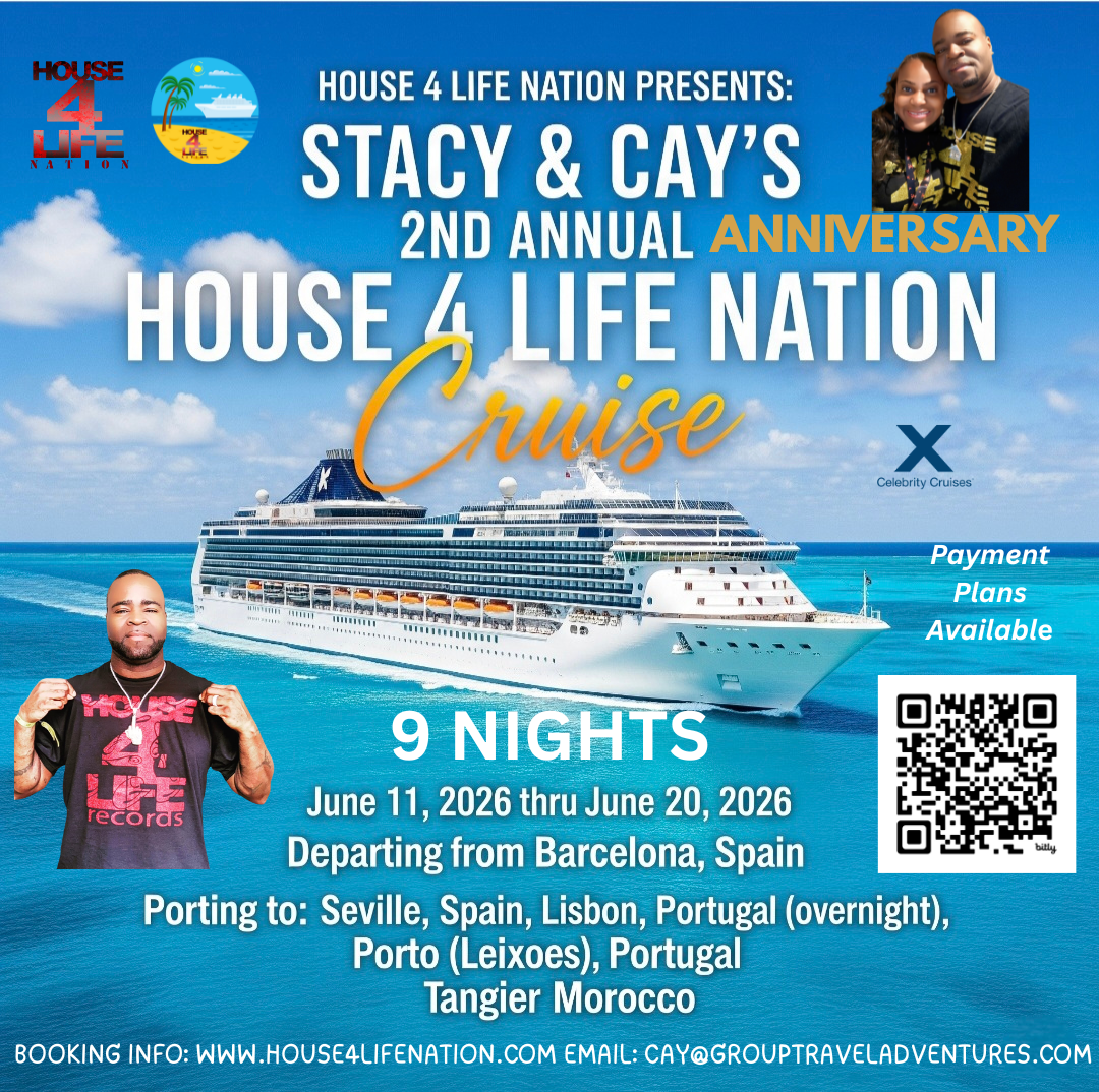 Join the House 4 Life Nation family for an incredible 9-night escape aboard the luxurious Celebrity Equinox, departing from the beautiful city of Barcelona, Spain, June 11, 2026 thru June 20, 2026. This isn't just a vacation; it's a celebration of life, music, and the beautiful anniversary of Stacy and Cay themselves.