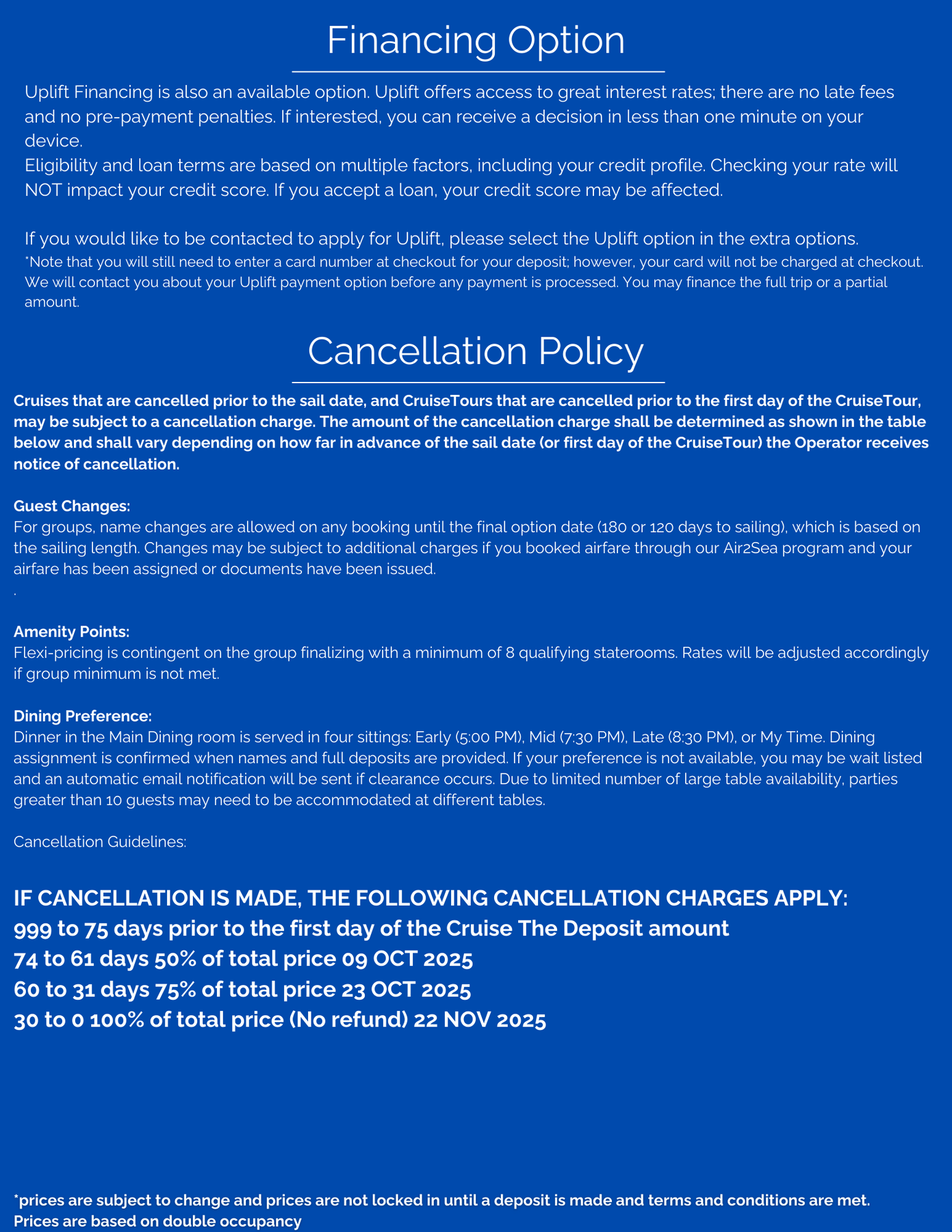 All staterooms and suites come complete with private bathroom, vanity area, hair-dryer, TV, radio and phone. Two twin beds that convert to a Royal King bed. Stateroom: 182 sq. ft. Balcony: 50 sq. ft.