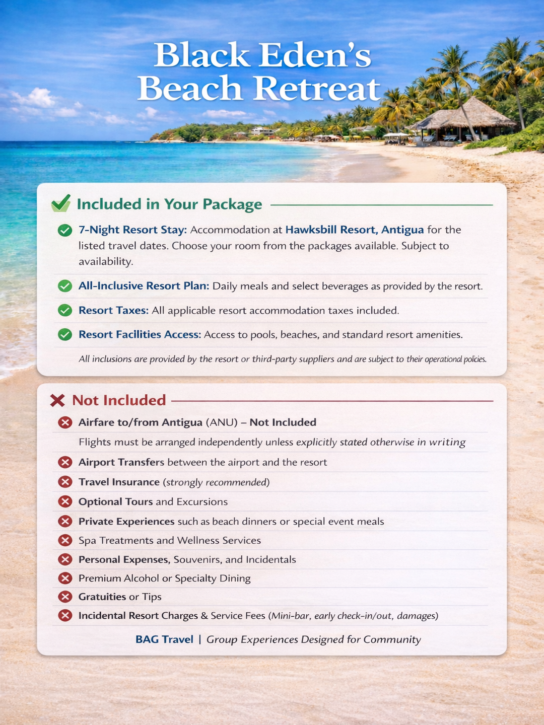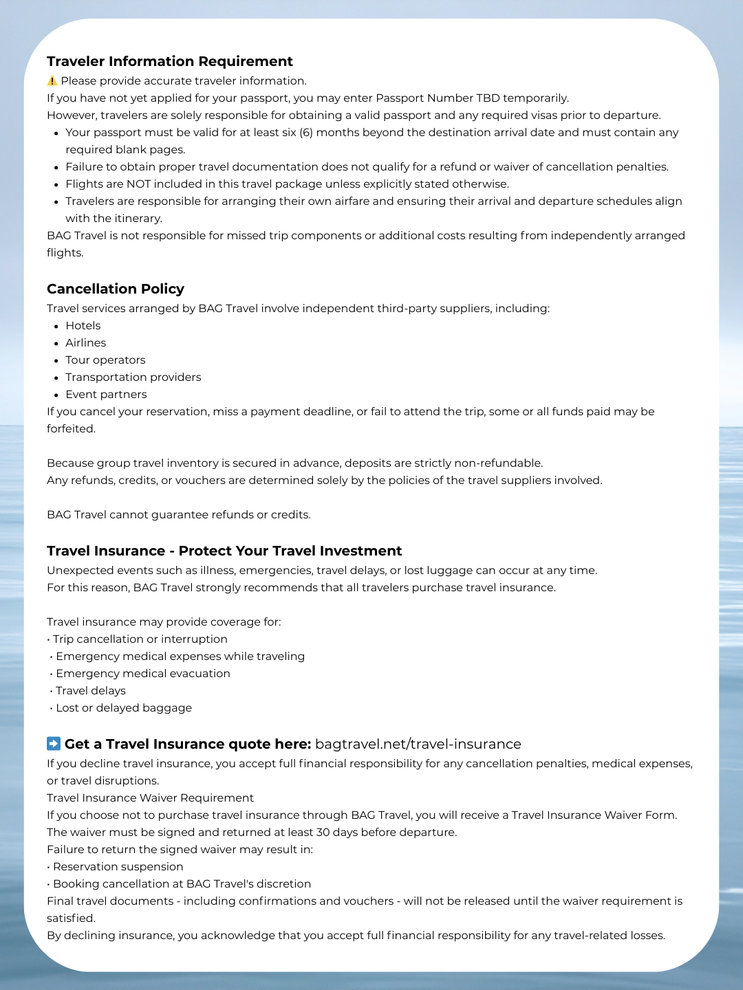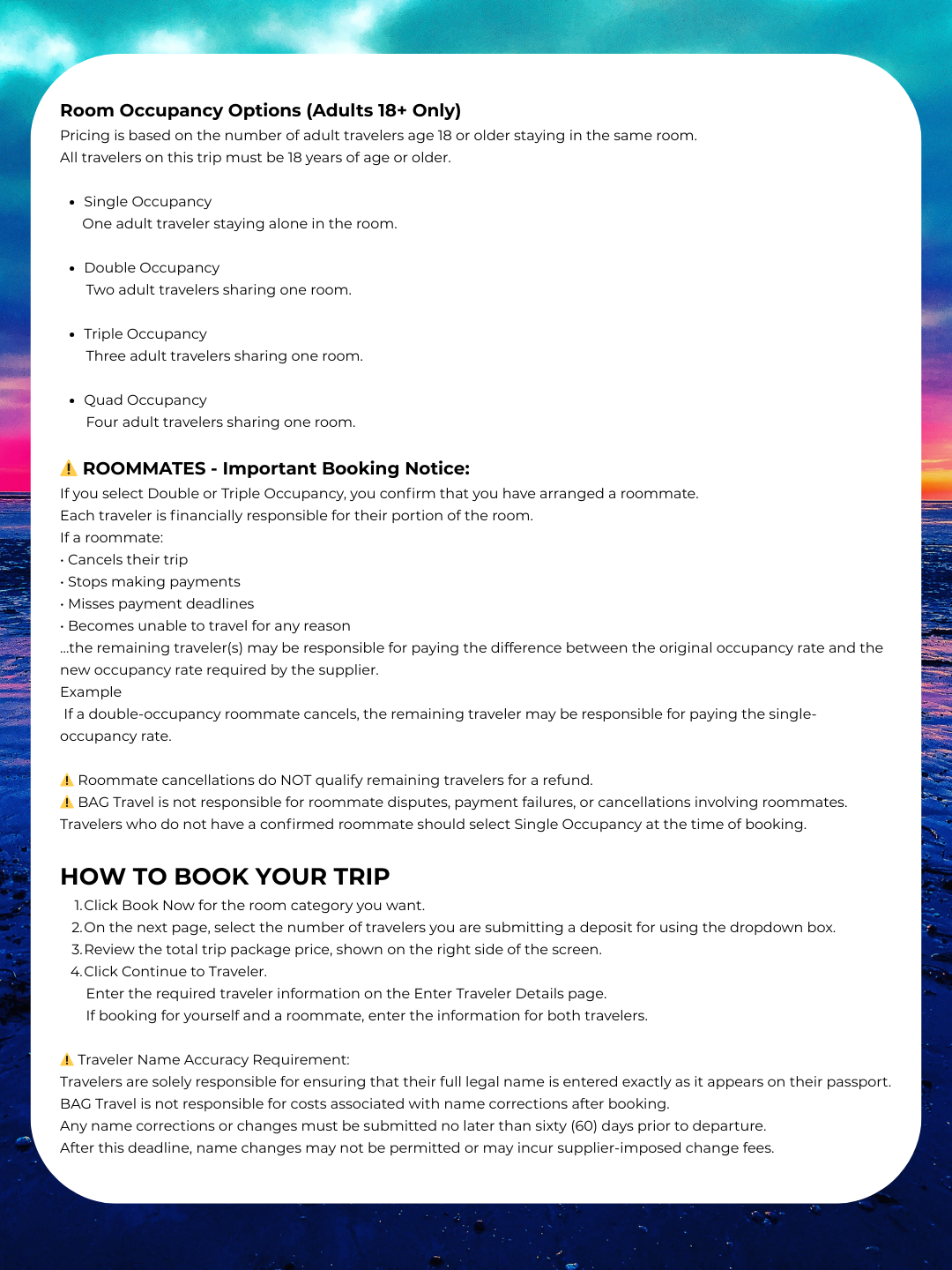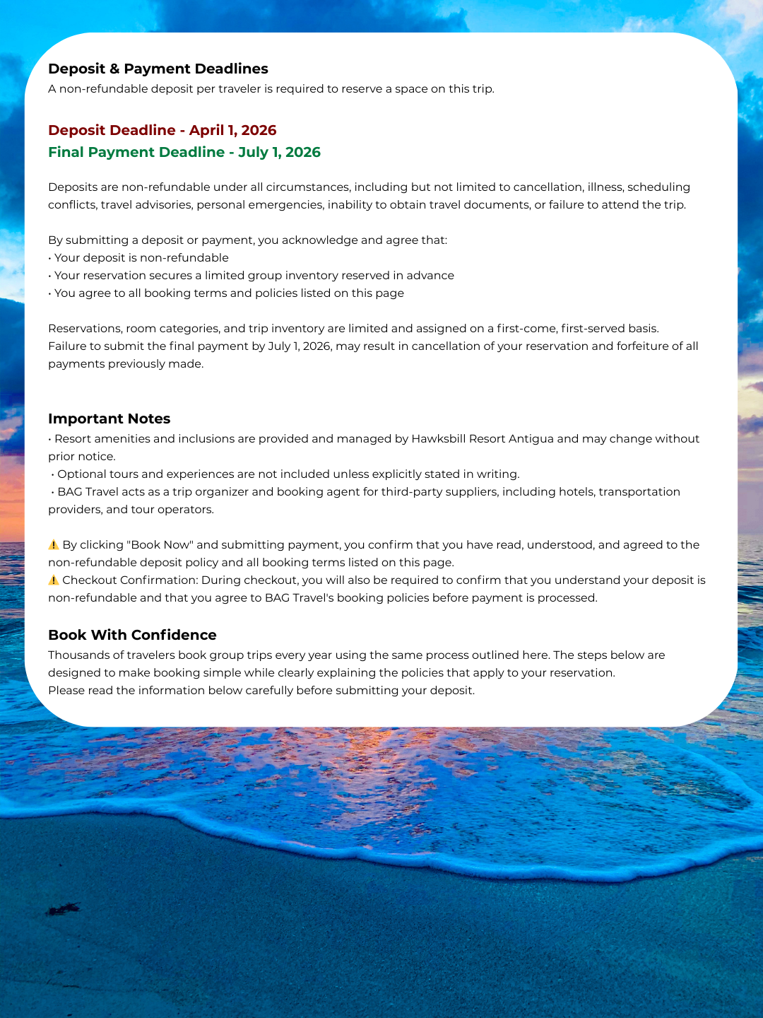 CAPACITY IS LIMITED, and reservations are processed on a first-come, first-served basis. Payment submission does not guarantee availability until confirmed by BAG Travel. If inventory becomes unavailable or an overbooking occurs, the reservation will be cancelled and a full refund issued to the original form of payment within 72 business hours.