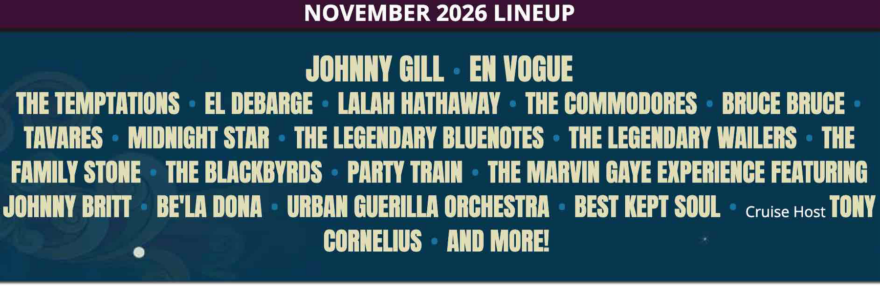 Mark your calendars and spread the word because the Soul Train Cruise 2.0 will be hitting the high seas again in Fall 2026! Get ready to groove on the most soulful cruise at sea! Join us for 7 nights of nonstop funk, R&B, soul, and classic Motown, featuring legendary artists and live performances, exclusive artist meet & greets, pool parties, dance classes, and that unmistakable Soul Train spirit.  Whether you're a returning guest or new to the experience, this is your invitation to relive the legacy of the iconic Soul Train television show and celebrate the music that moved you then and still moves you now.