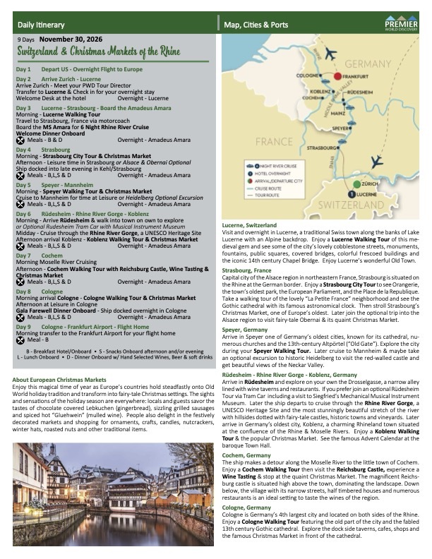 Switzerland & Christmas Markets of the Rhine featuring Lucerne, Strasbourg & 6 Nights aboard the Amadeus Amara for 9 Days starting November 30, 2026