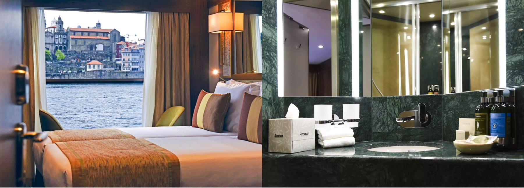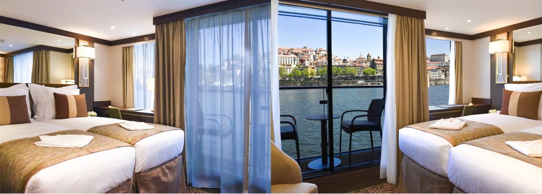 The Superior Balcony Suites feature the same high quality furnishings and fittings as the standard cabins. They have floor-to-ceiling windows plus sliding doors extending on to a small private balcony with a table and two chairs. Enjoy an aperitif at the table for two here and watch the delightful river-world go by.