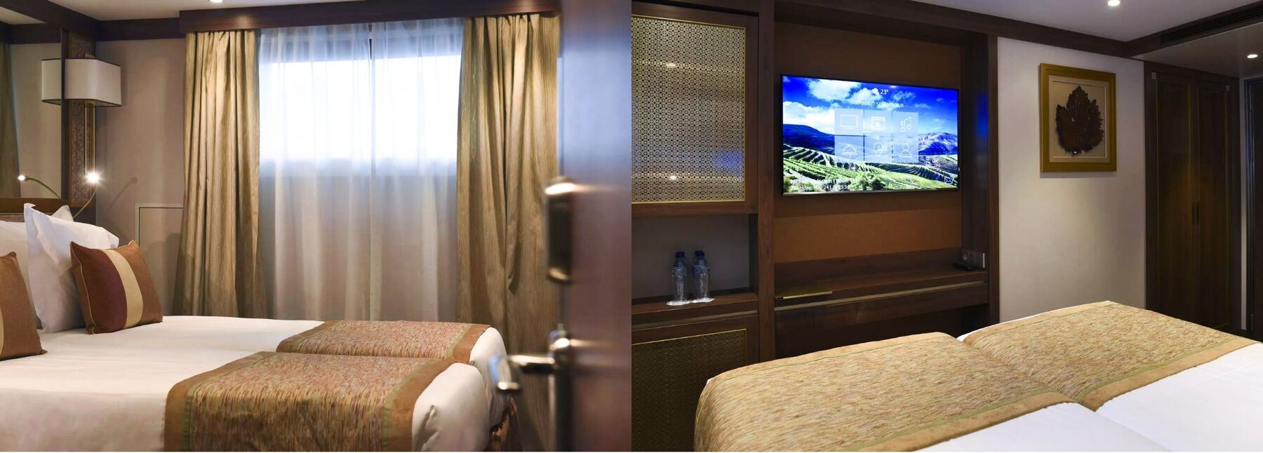 The Middle) Deck cabin is 14 square metres (151 square feet) and have full floor to ceiling windows which slide down halfway so you can watch the stunning river scenery drifting past without leaving the comfort of your cabin!