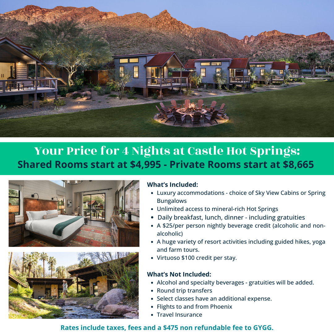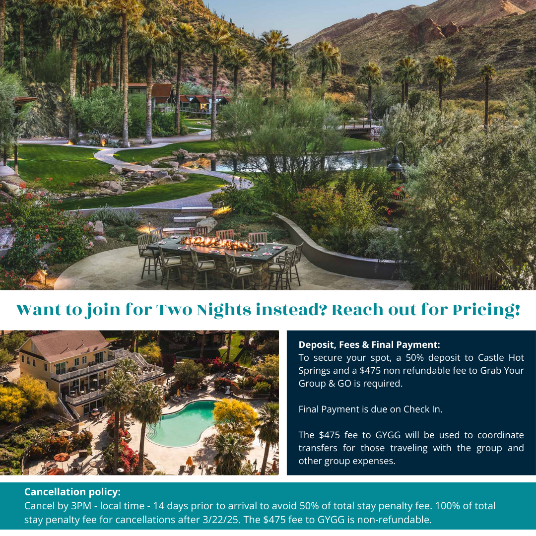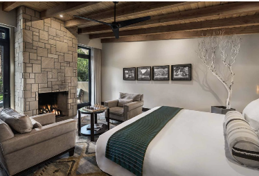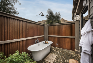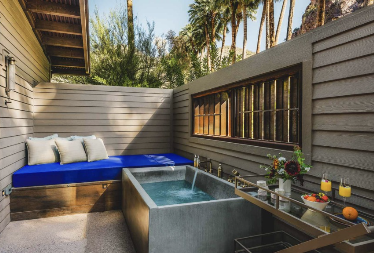 Soak in the healing properties of the natural spring waters in the comfort of a private Sonoma stone tub as you embrace pure serenity and relaxation in a Spring Bungalow. An inviting outdoor covered patio with comfortable lounge furniture and a fireplace provide comfort year-round. Gaze on the quiet peaks and swaying palm trees.