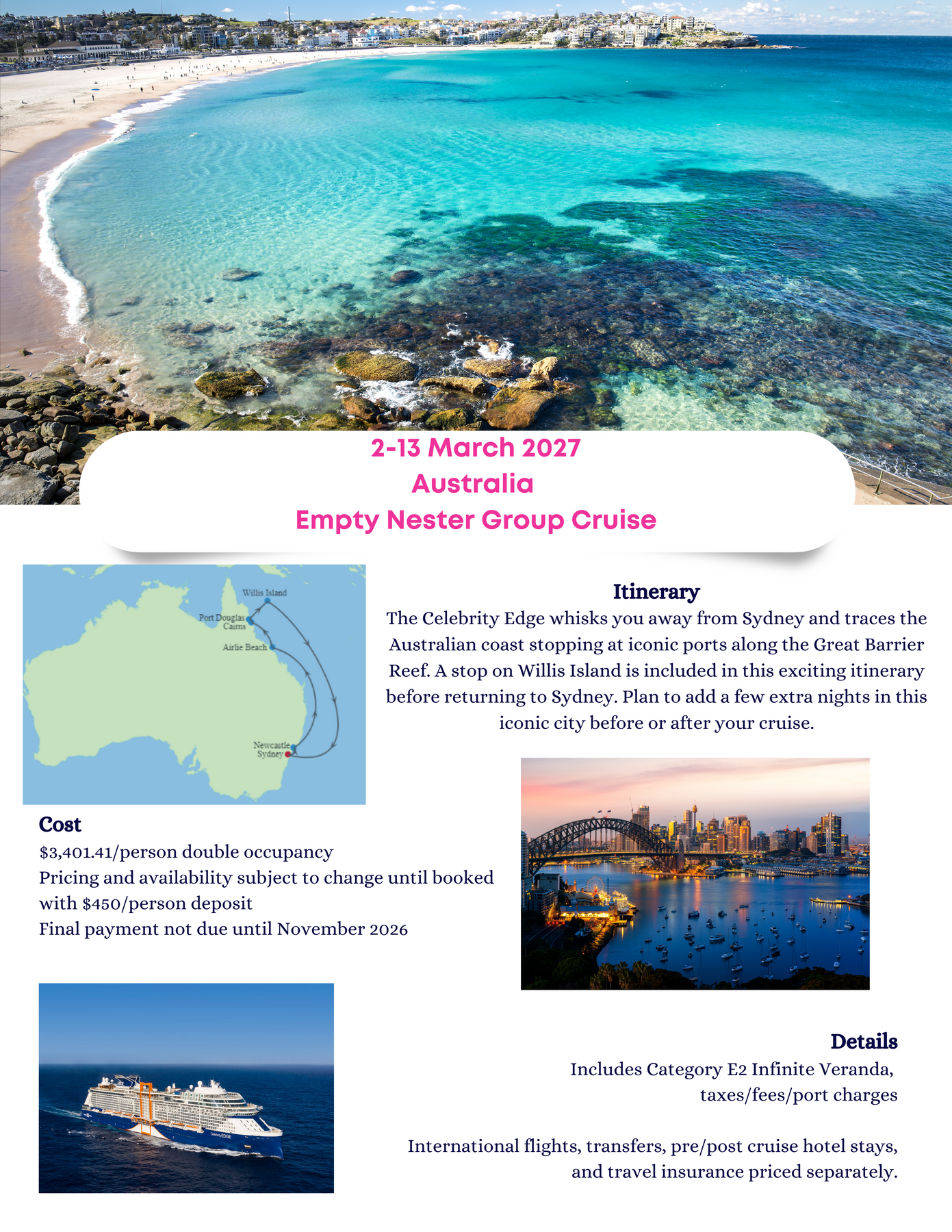 International flights, transfers, pre/post cruise hotel stays, and travel insurance priced separately.