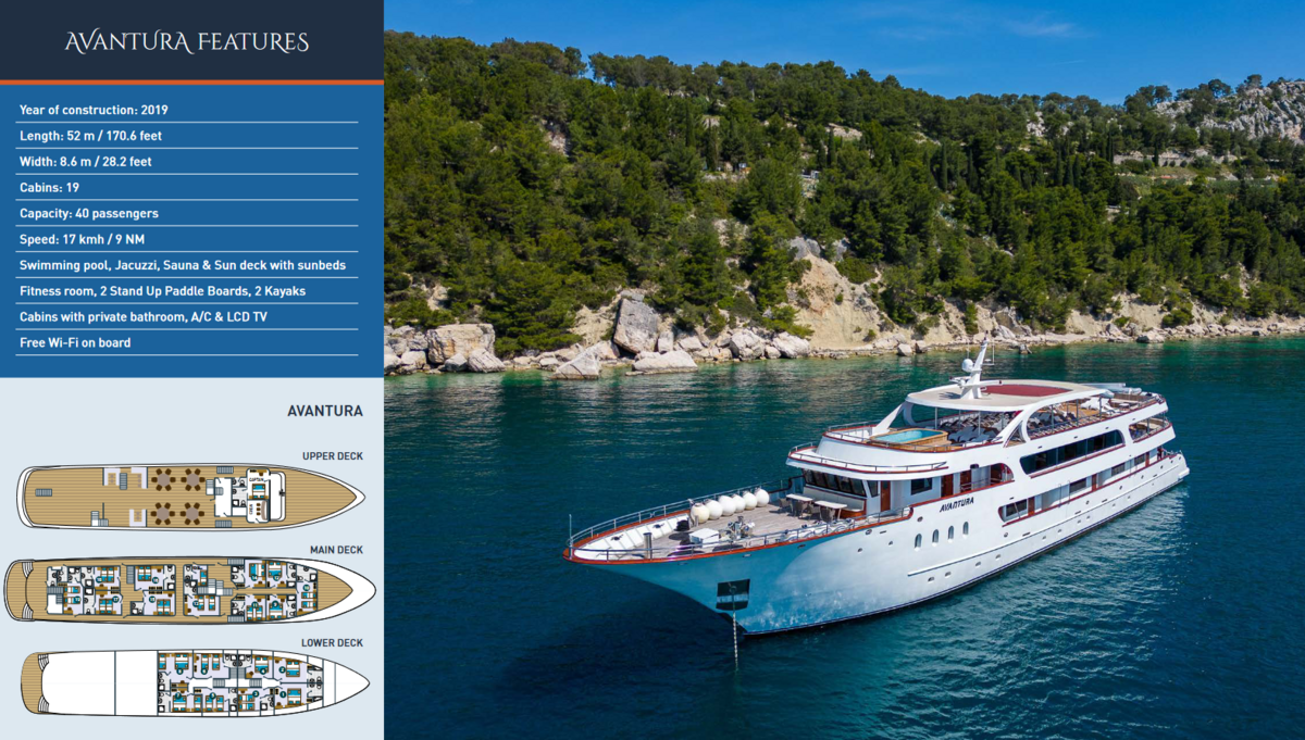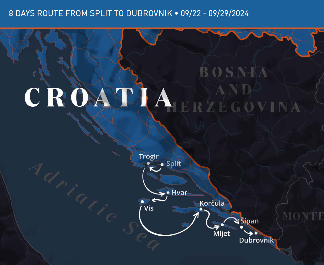 The itinerary schedule, as well as the corresponding services, are subject to change according to the decision of the ship's captain. In the case of bad weather, the captain has the right to modify the itinerary to ensure the safety and protection of the passengers. Please note that due to the limited capacity of some ports, the overnights may be replaced by other ports (i.e. Hvar could be replaced by Stari Grad or Jelsa).
