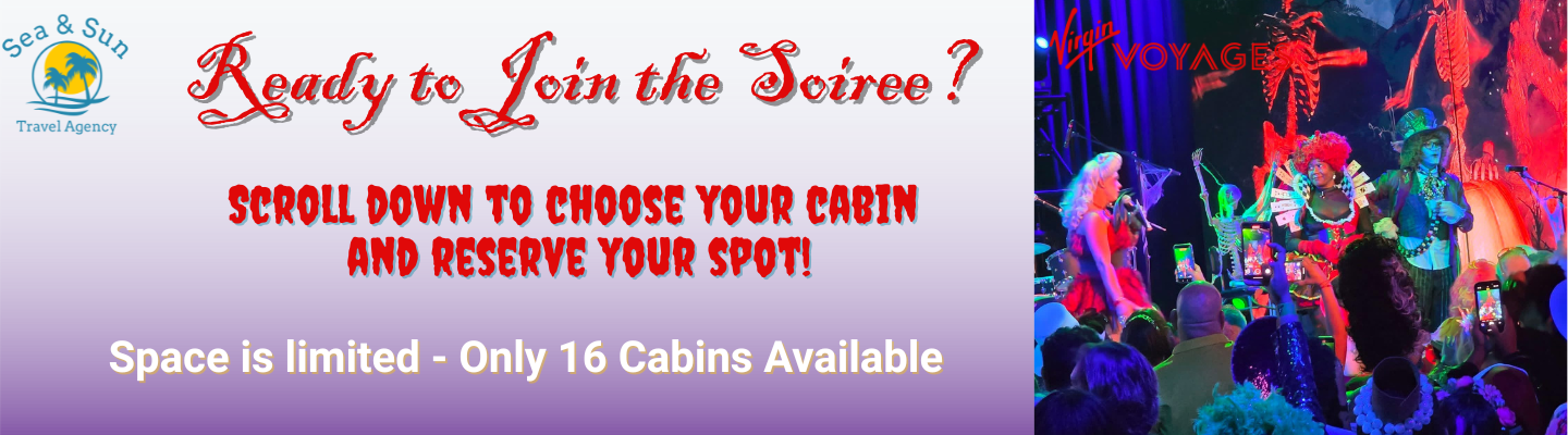 You can book your cabin on this cruise and embark on the Haunted Halloween Soiree adventure of a lifetime right here on our website! Don't wait too long, as availability is limited. Cabins availability and pricing is subject to change without notice. Must be 18 in order to sail with Virgin Voyages.