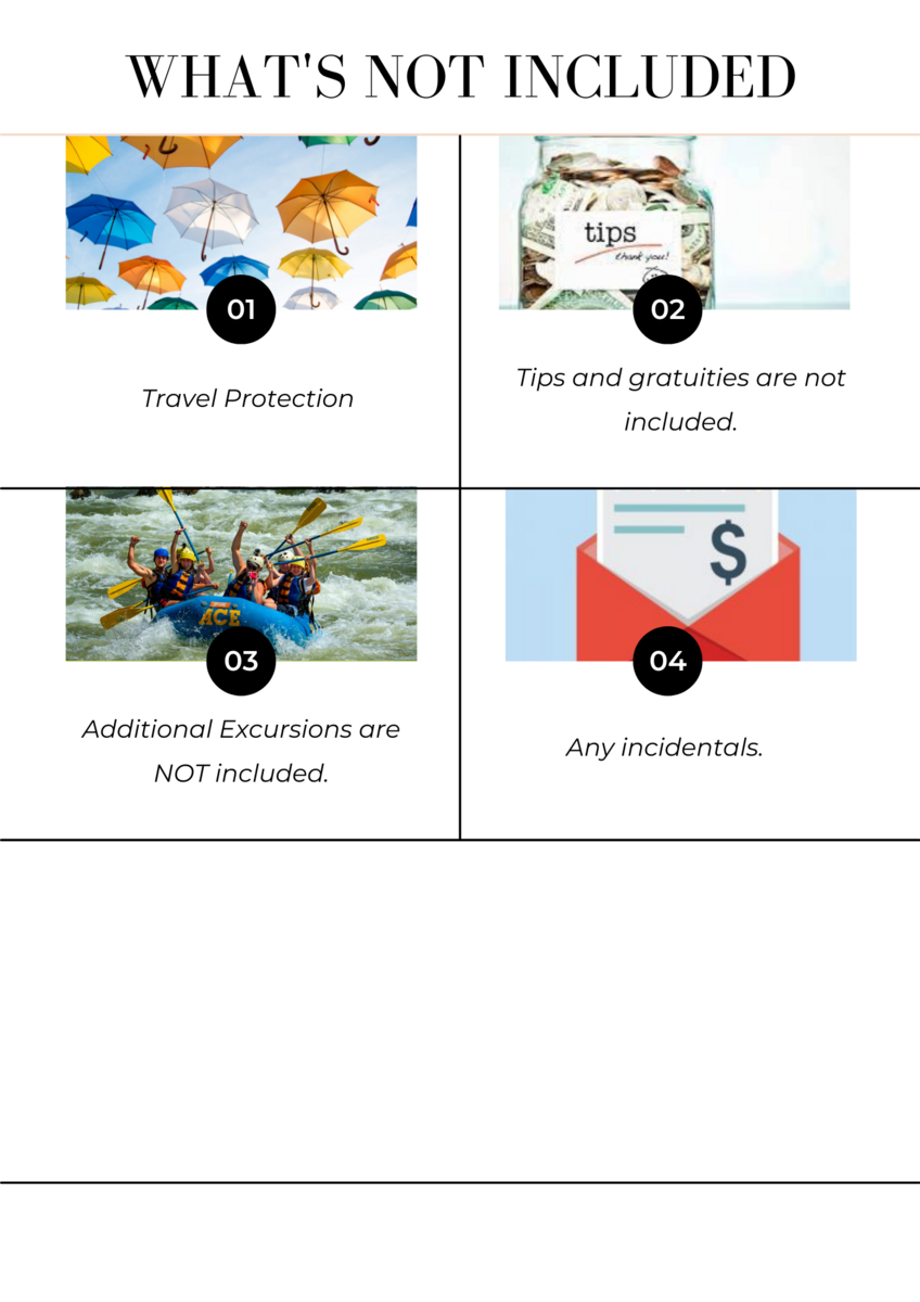 ***Package includes the components listed above. Price is subject to change until deposit is made. Price excludes travel protection, additional excursions, and items of a personal nature. Valid passports are required for international travel, Covid-19 protocols may apply. ***