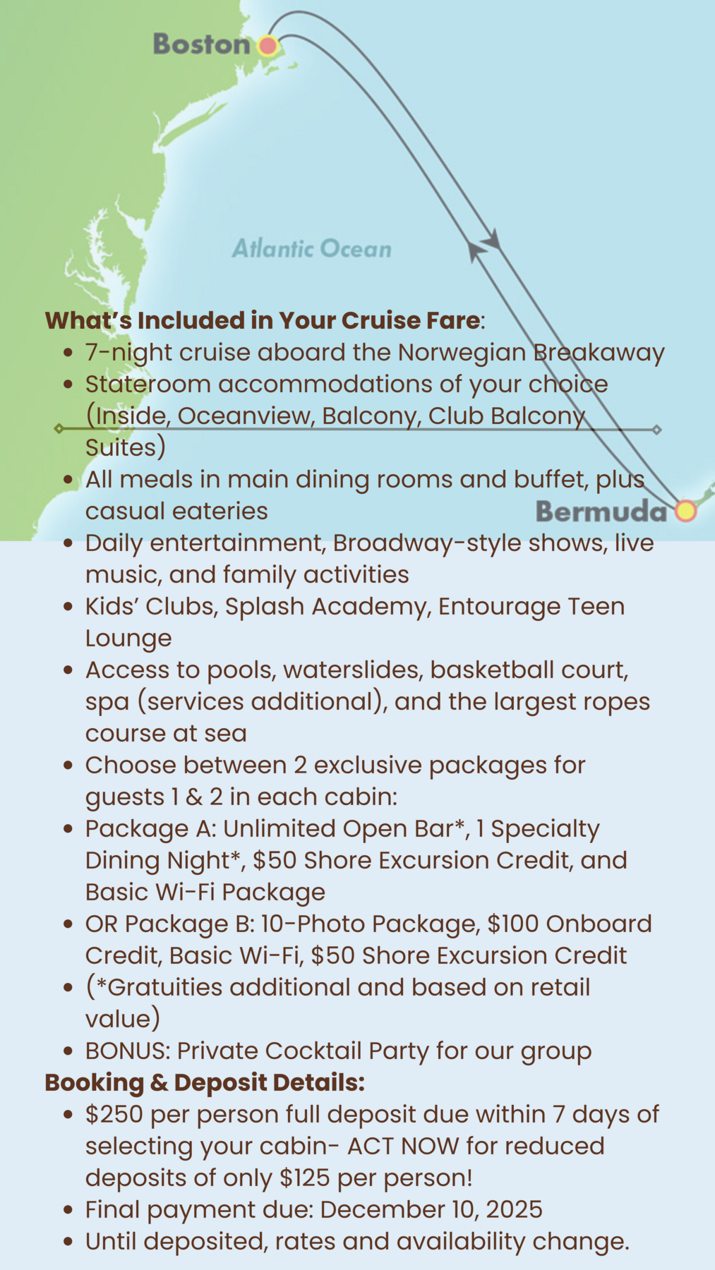 Why hassle with driving, traffic, and parking fees when you can start your vacation relaxed? We’re organizing a shared roundtrip transfer from two convenient Cape Cod pickup locations straight to the cruise port.