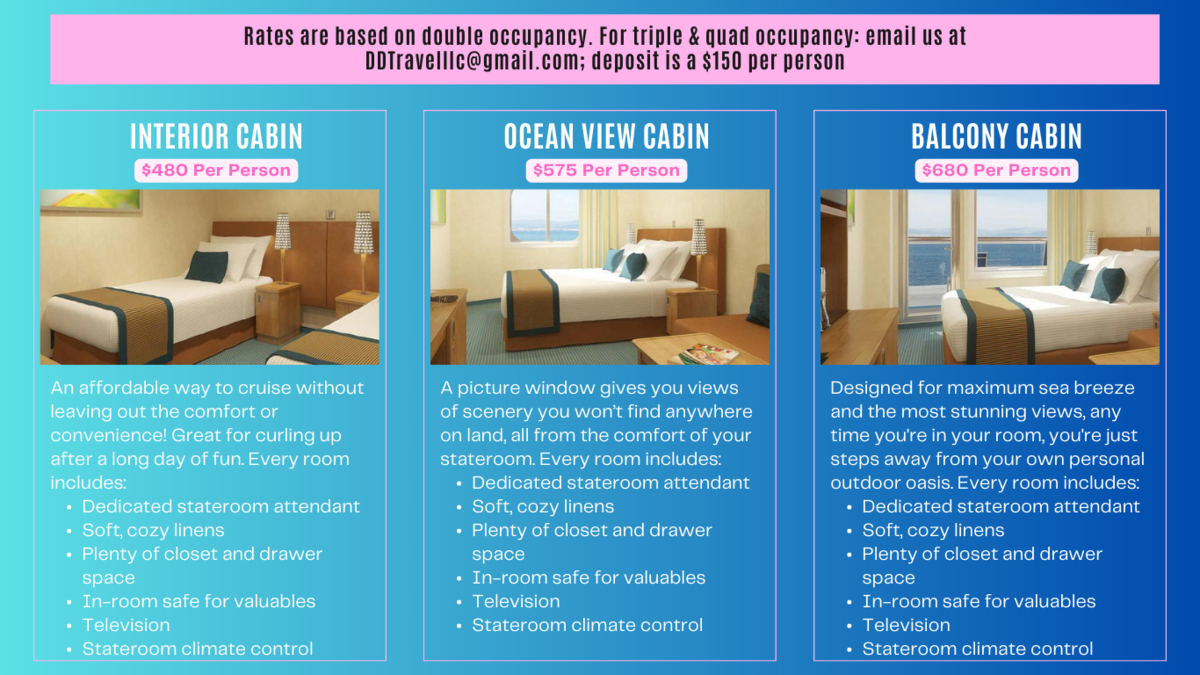 An affordable way to cruise without leaving out the comfort or convenience! Great for curling up after a long day of fun. Every room includes:
