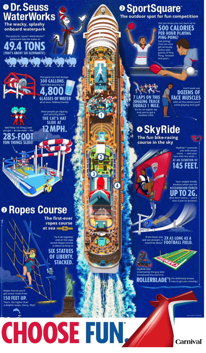 Then, when it’s time to cool off, visit one of Carnival Horizon’s flashiest, splashiest features—Dr. Seuss™ WaterWorks™, where Dr. Seuss characters transform the waterpark experience into a delightfully riddle-filled ride, that’s fun for all ages, with The Cat’s Hat slide, Fun Things slide, a tipping top-hat and spray toys galore.