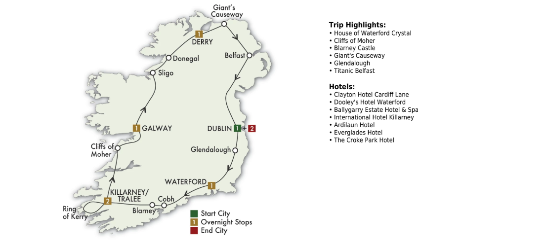 Experience the very best of Ireland on this fast-paced, unforgettable 9-day tour, beginning and ending in Dublin. From iconic sights like the Cliffs of Moher, Blarney Castle, and Giant’s Causeway to rich cultural stops such as the House of Waterford Crystal and Titanic Belfast, this adventure is packed with history, scenic beauty, and Irish charm. Enjoy immersive experiences including a sheepdog demonstration, whiskey tasting, and lively traditional entertainment. With 14 meals and stays in top-class hotels across vibrant cities and serene countryside, this is the ultimate way to explore the heart and soul of Ireland.