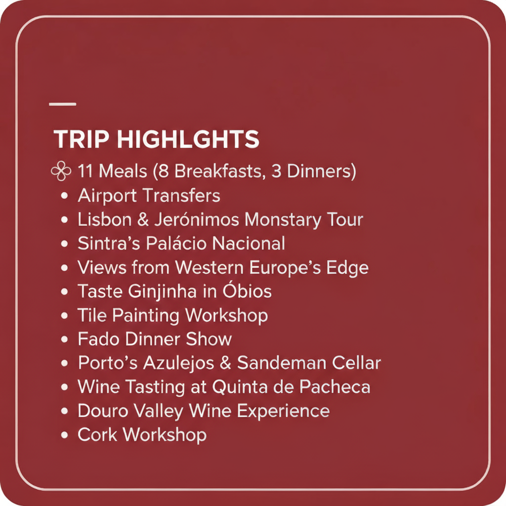 It’s not just the sun-soaked beaches, cobblestone streets, or vibrant nightlife—Portugal is known for its stunning natural landscapes, from golden beaches and picturesque coastlines to verdant mountains and the Douro Valley vineyards, a country that sweeps you off your feet. Join our exclusive group trip and experience the best of Portugal together.