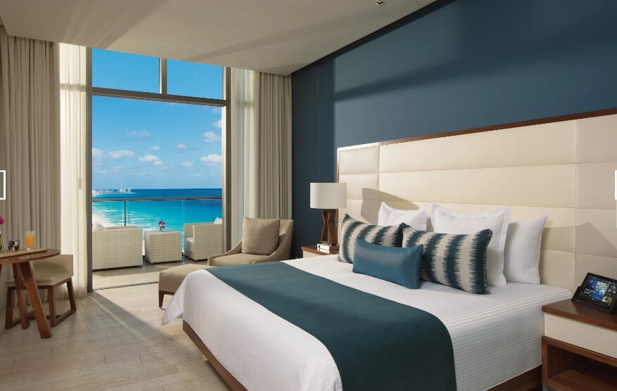 The Preferred Club offers a personal butler allowing you to check in on your own floor eliminating check in at the general reception area. The views of the Caribbean Sea and Laguna Nichupte from the private balcony are furnished with chaise lounge and table with 2 chairs.
