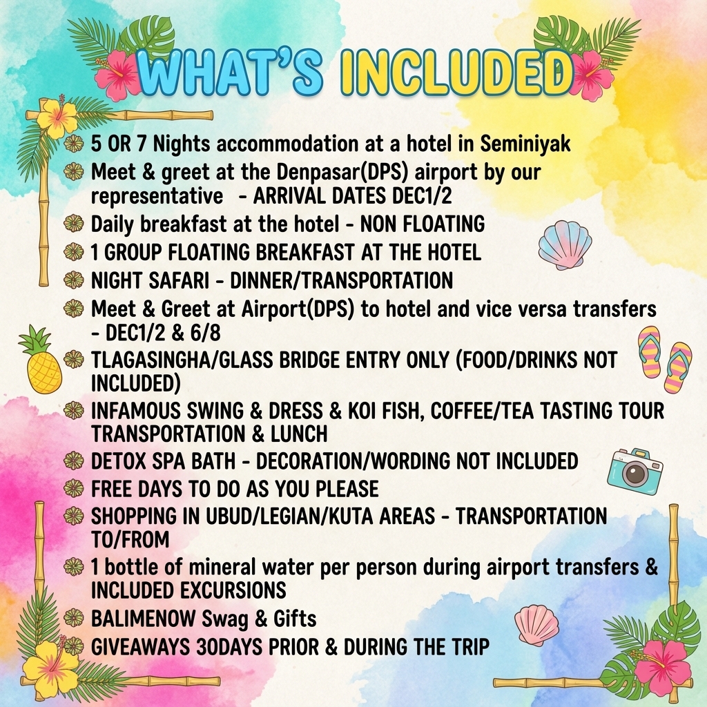 🛂 Passport: You DO NEED a passport for this trip. If you have a passport that is not from the US, or if you are not a US citizen, please let me know before paying the deposit, as things may be different for you. It will be your responsibility to ensure you meet all requirements for travel to Bali, including passport validity, visa requirements, and/or any other documents based on your country of residence. Each traveler outside of the United States will be asked to sign a waiver acknowledging responsibility. For guidance, reach out to your country’s embassy or consulate.