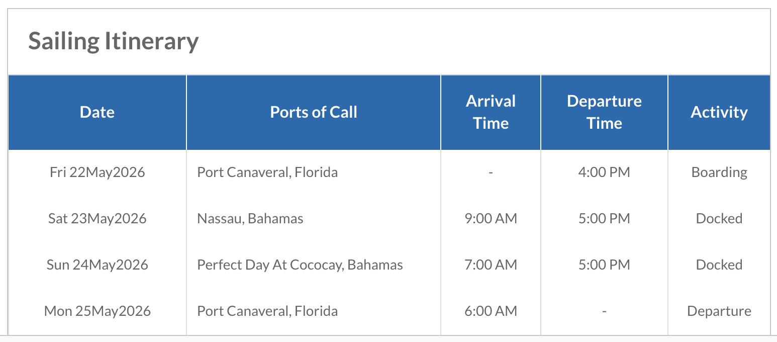 Price shown includes taxes, port charges and fees. Mandatory gratuities and Travel Protection are additional and can be paid prior to sailing or on the ship.