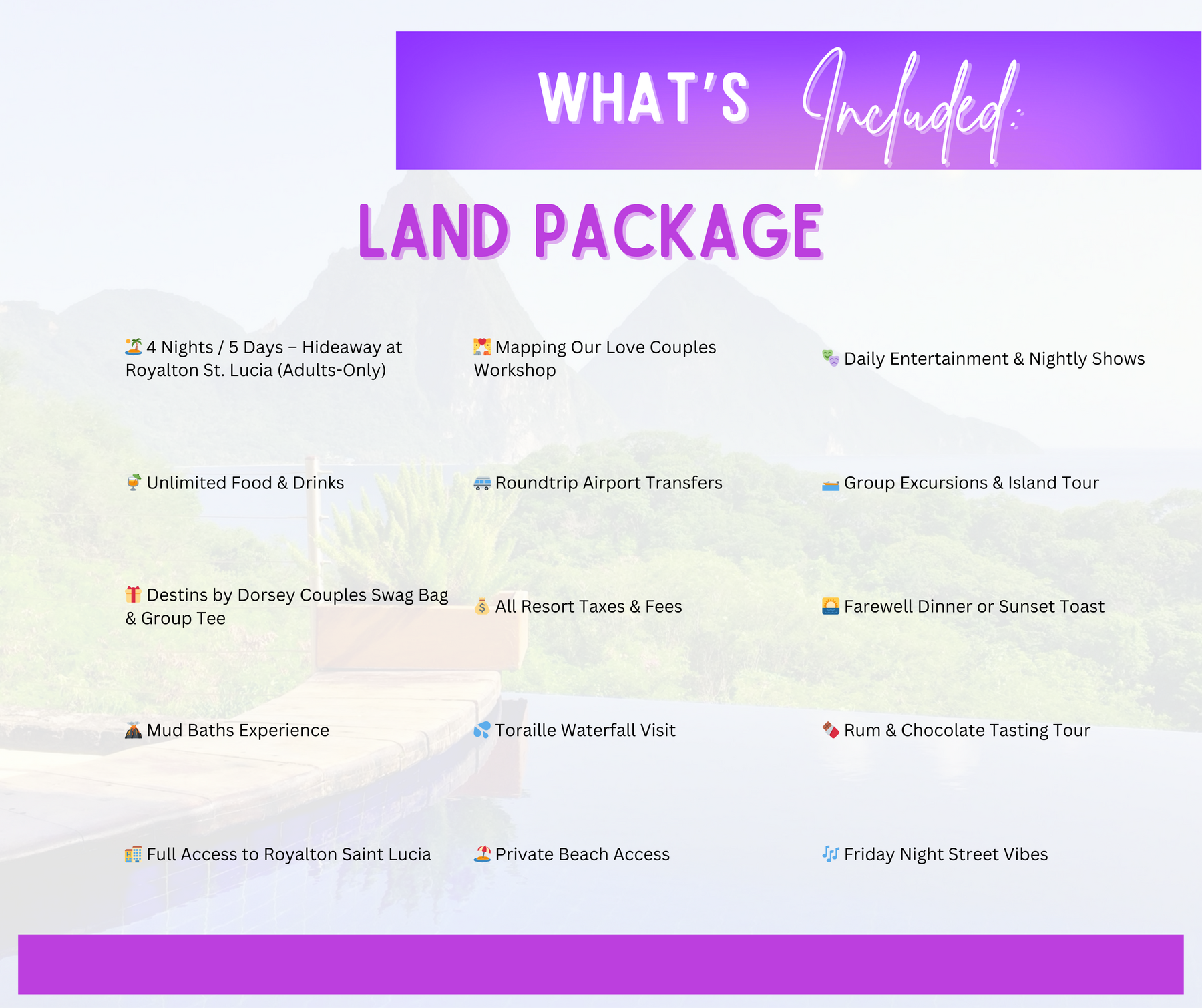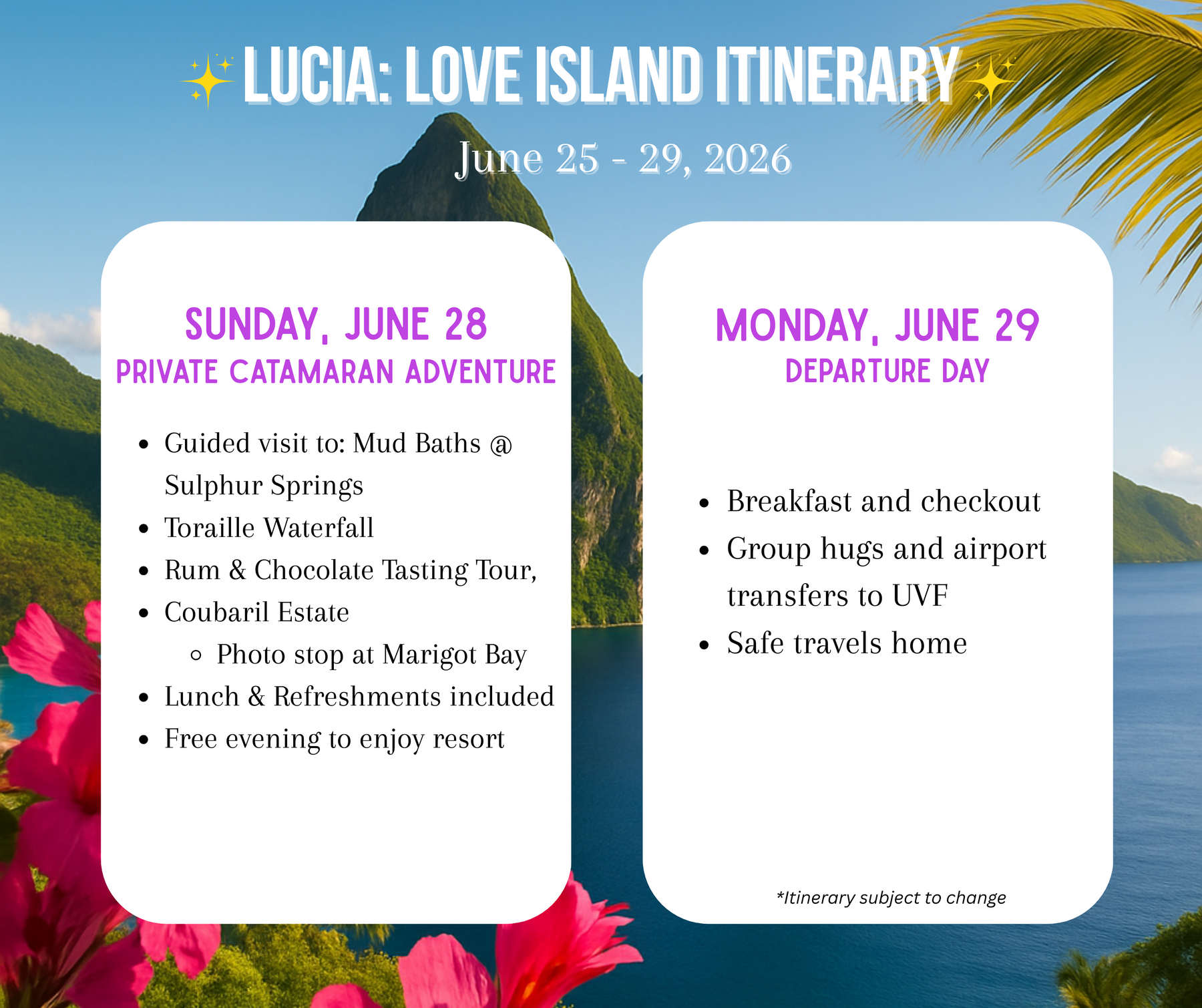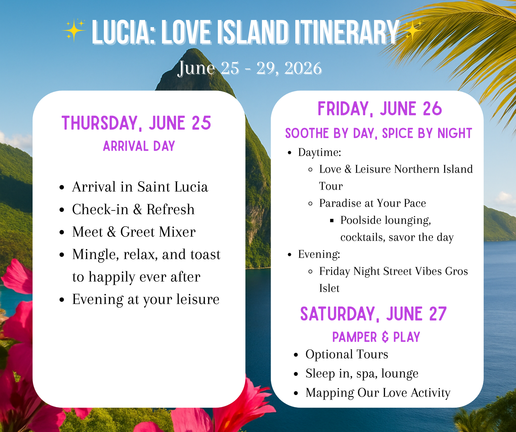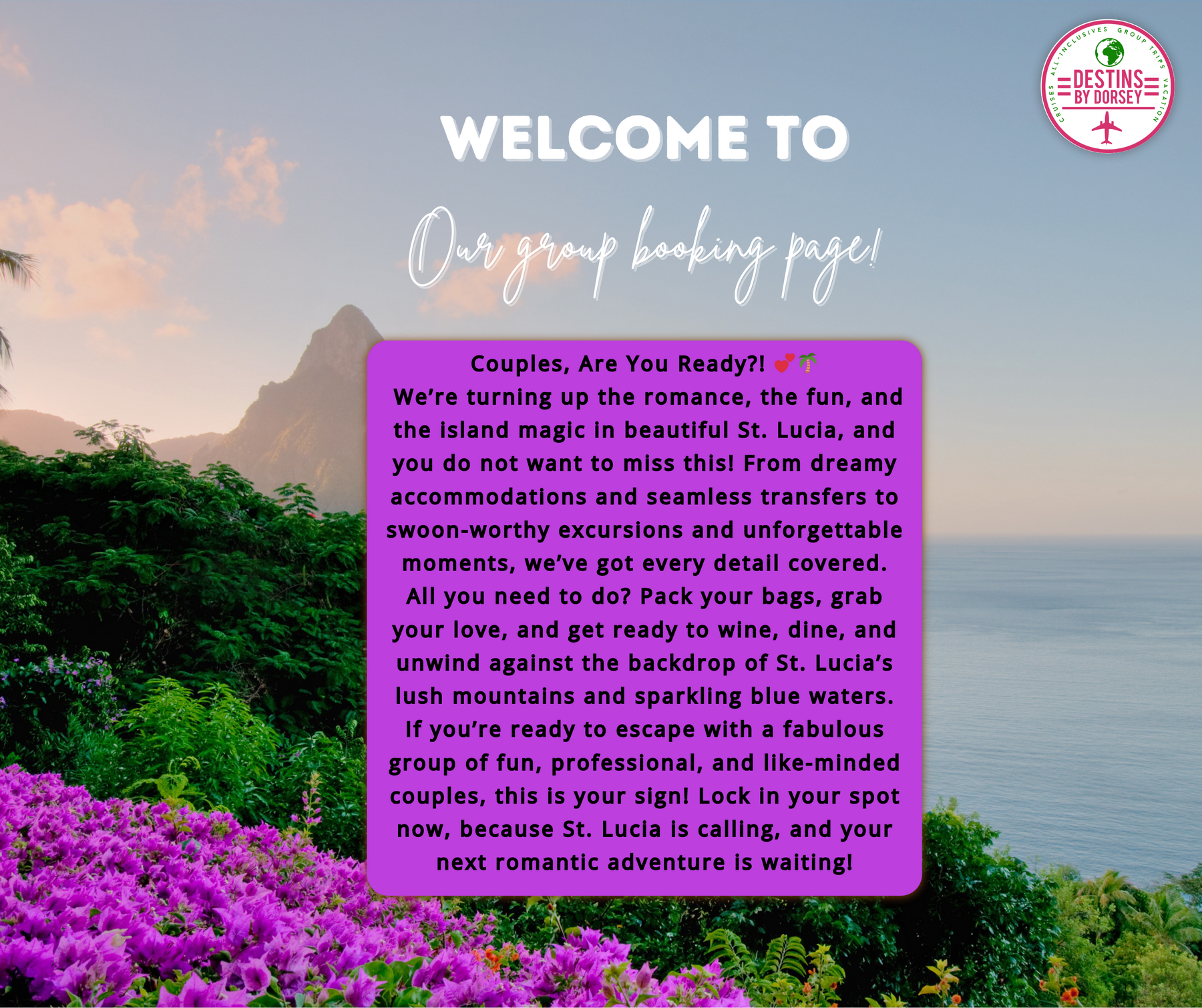 Whether you’re lounging by the infinity pool, exploring island treasures hand-in-hand, or dancing under the stars in Gros Islet, this St. Lucia escape is your invitation to reconnect, rekindle, and create unforgettable memories, all in the company of other like-minded couples.