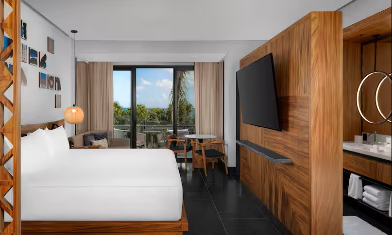 Take in spectacular ocean views from your 505 sq. ft. room, boasting a relaxation tub for two on the balcony. Enjoy a comfortable sitting area and sunlight from floor-to-ceiling windows. The room features a spa-like bathroom with a large shower, double sinks, and a separate vanity. The soaking tub is on the balcony, offering an exceptional way to relax with a view.