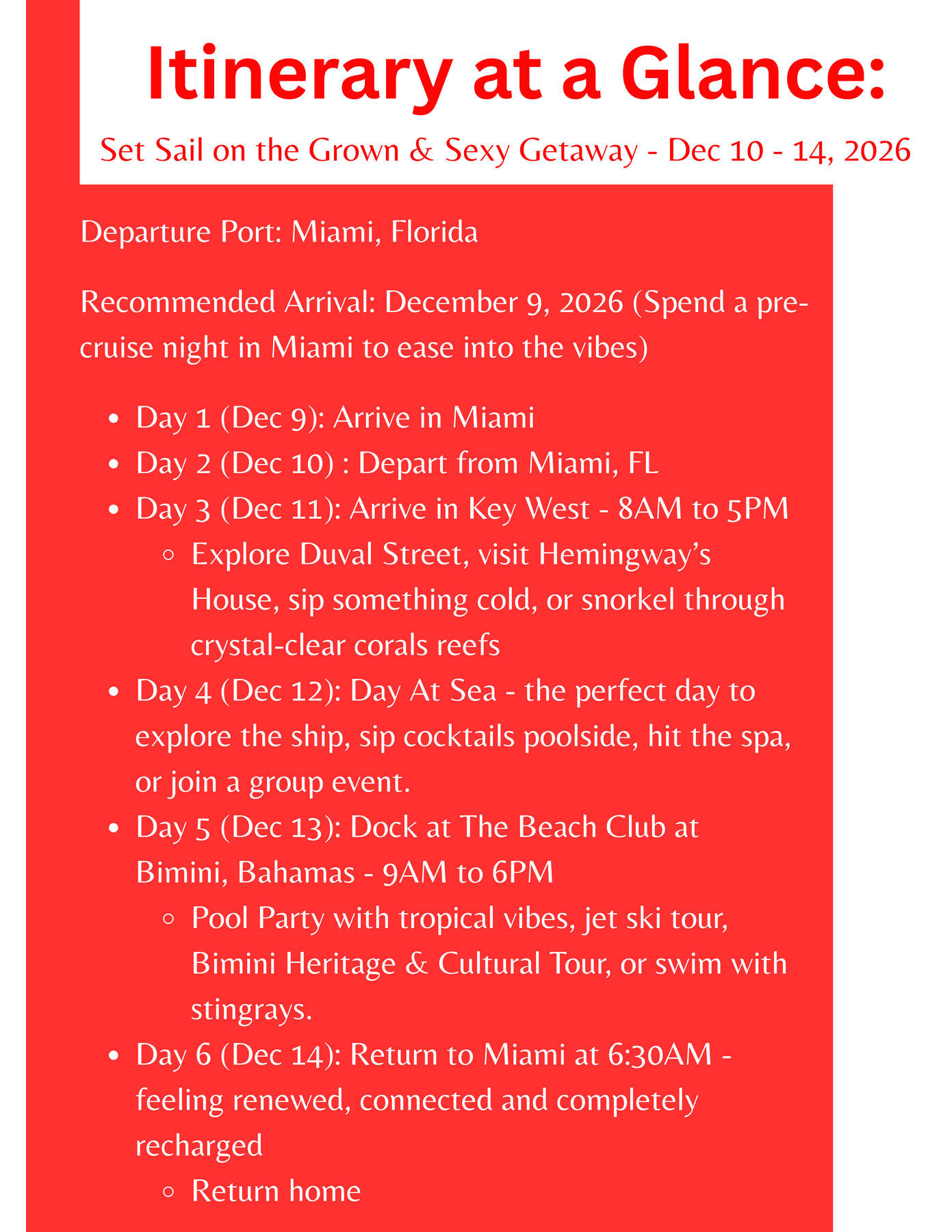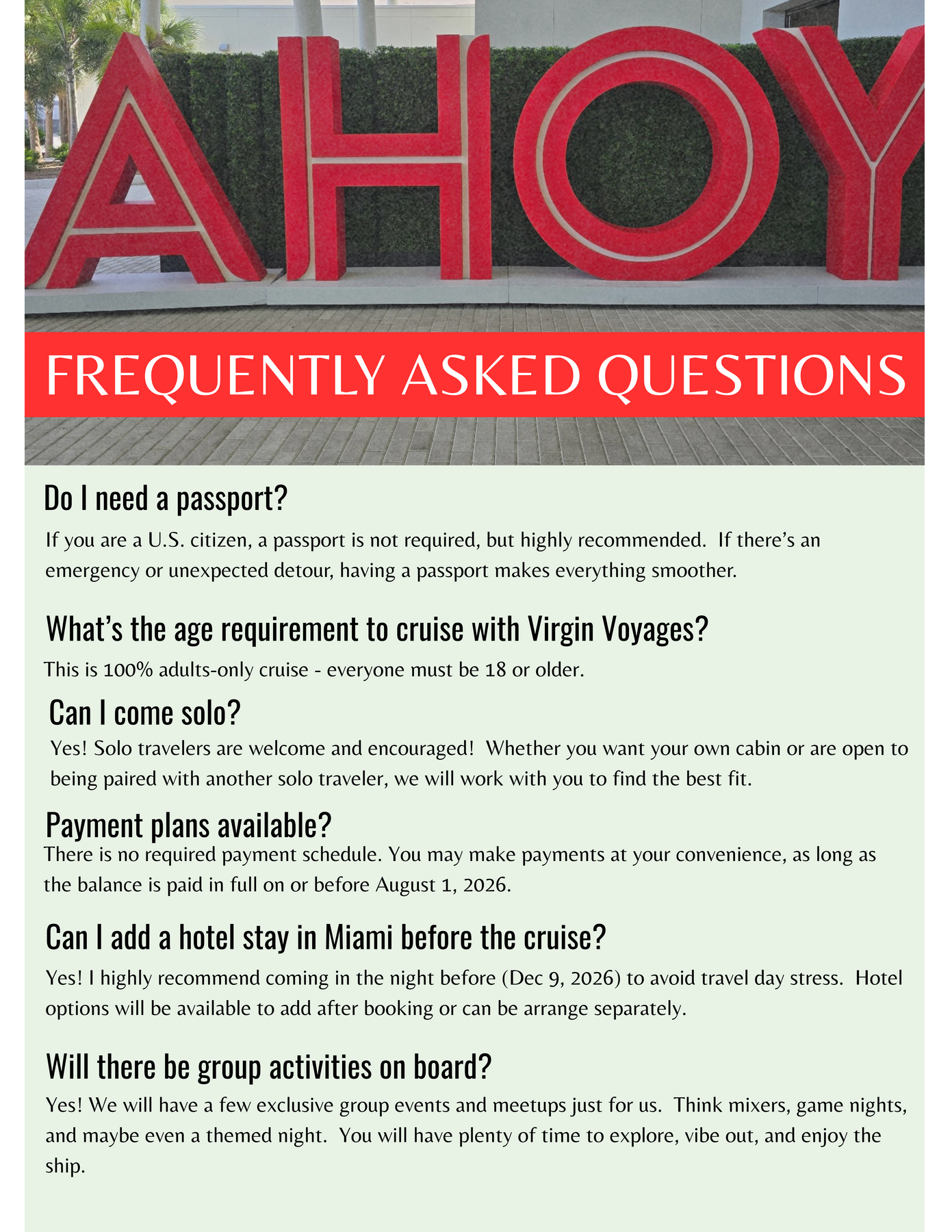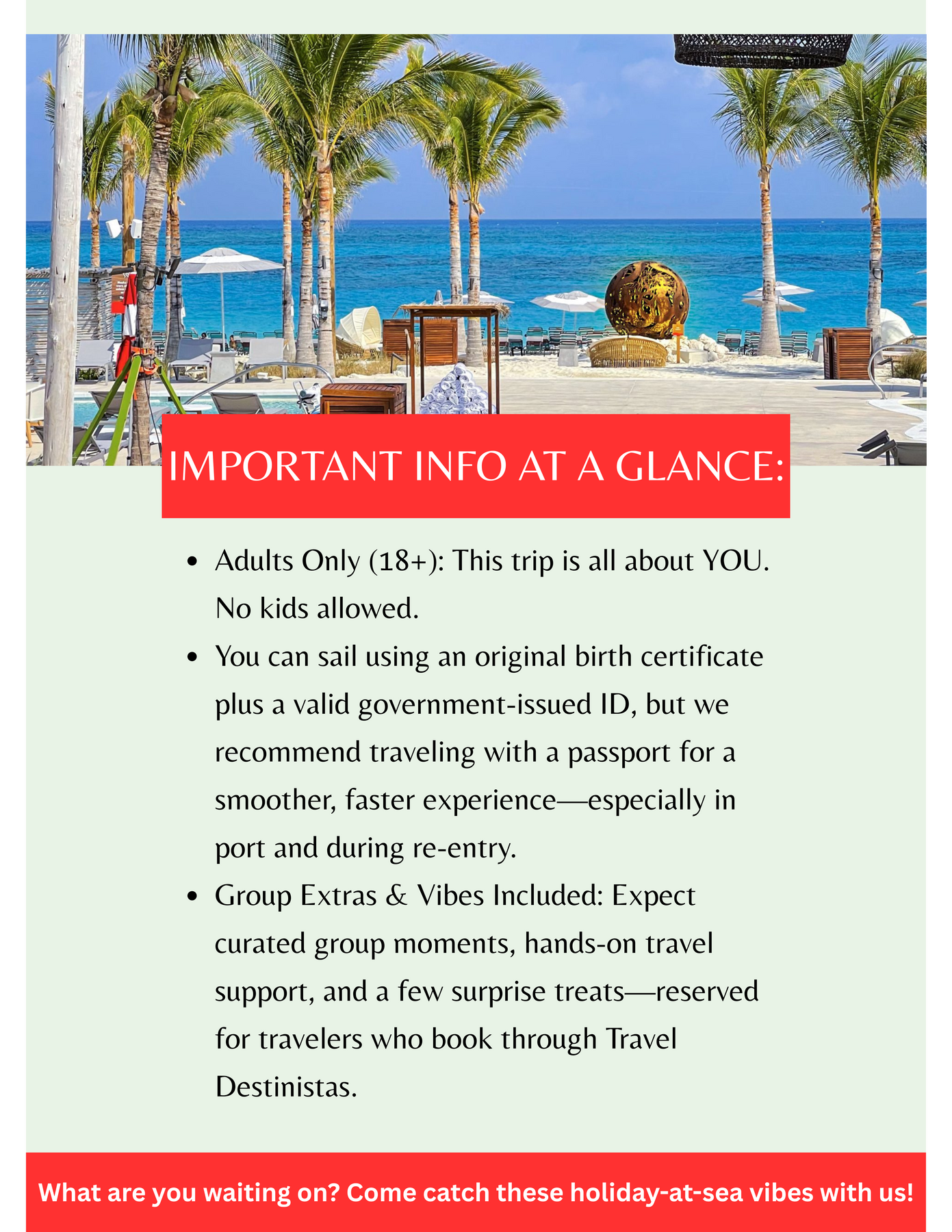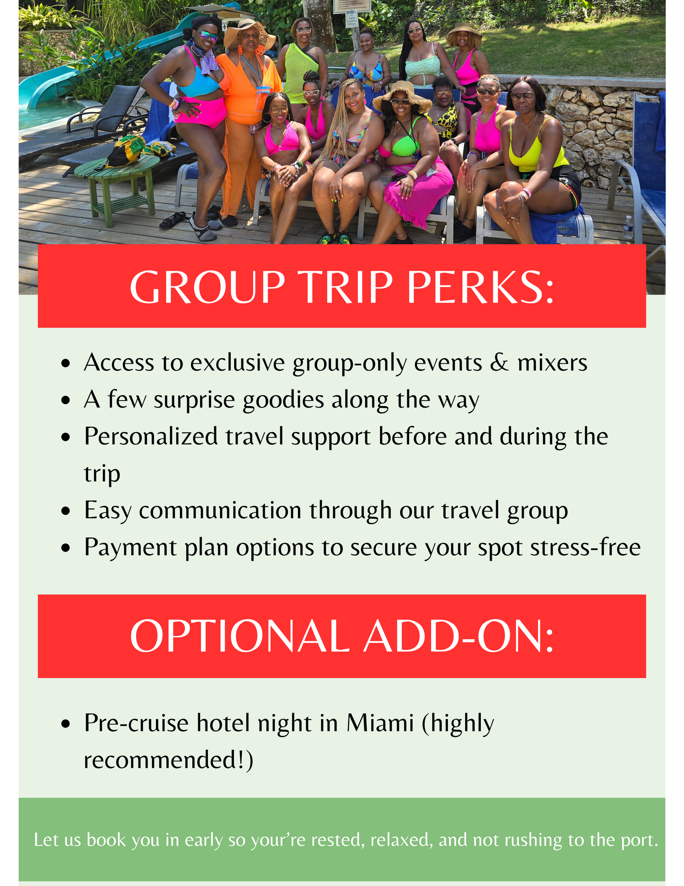 Still waiting on the group chat to make a decision? Yeah… no. Don’t let anyone else’s “I’ll let you know” delay your passport plans. With our roommate matching option, you can book your spot solo and we’ll help pair you with a like-minded travel bestie. When you register, simply check 'I am booking solo and would like to be matched with a roommate' under Roommate Clause section. After securing your spot with a non-refundable deposit, a short compatibility questionnaire will be emailed to you so we can match you based on your travel style and preferences. Once both roommates are at least 75% paid, we’ll connect you before wheels up. Bottom line: you don’t need a full squad to take the trip.