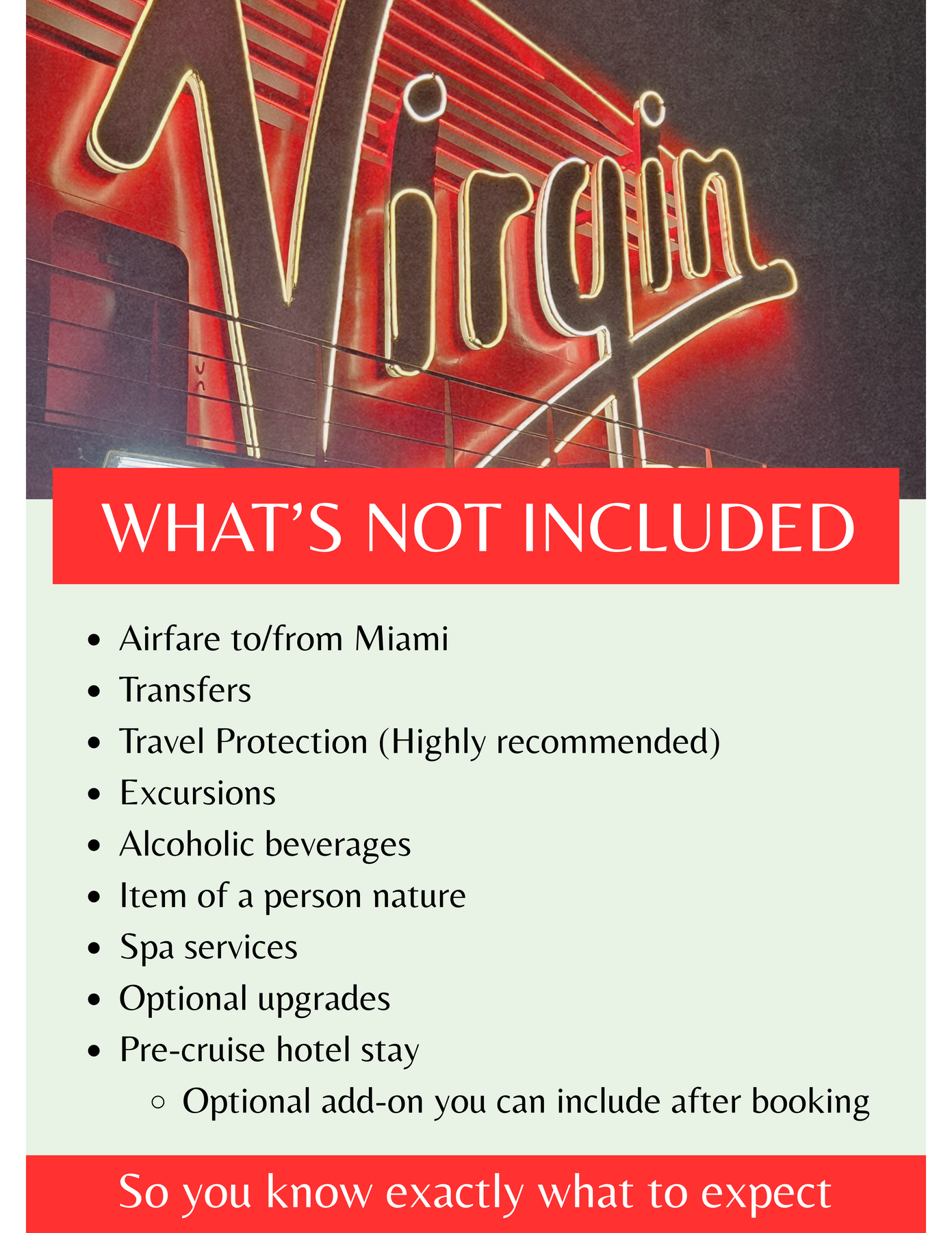 Virgin Voyages does not offer price matching; if prices drop, you must cancel and rebook, which may incur fees.