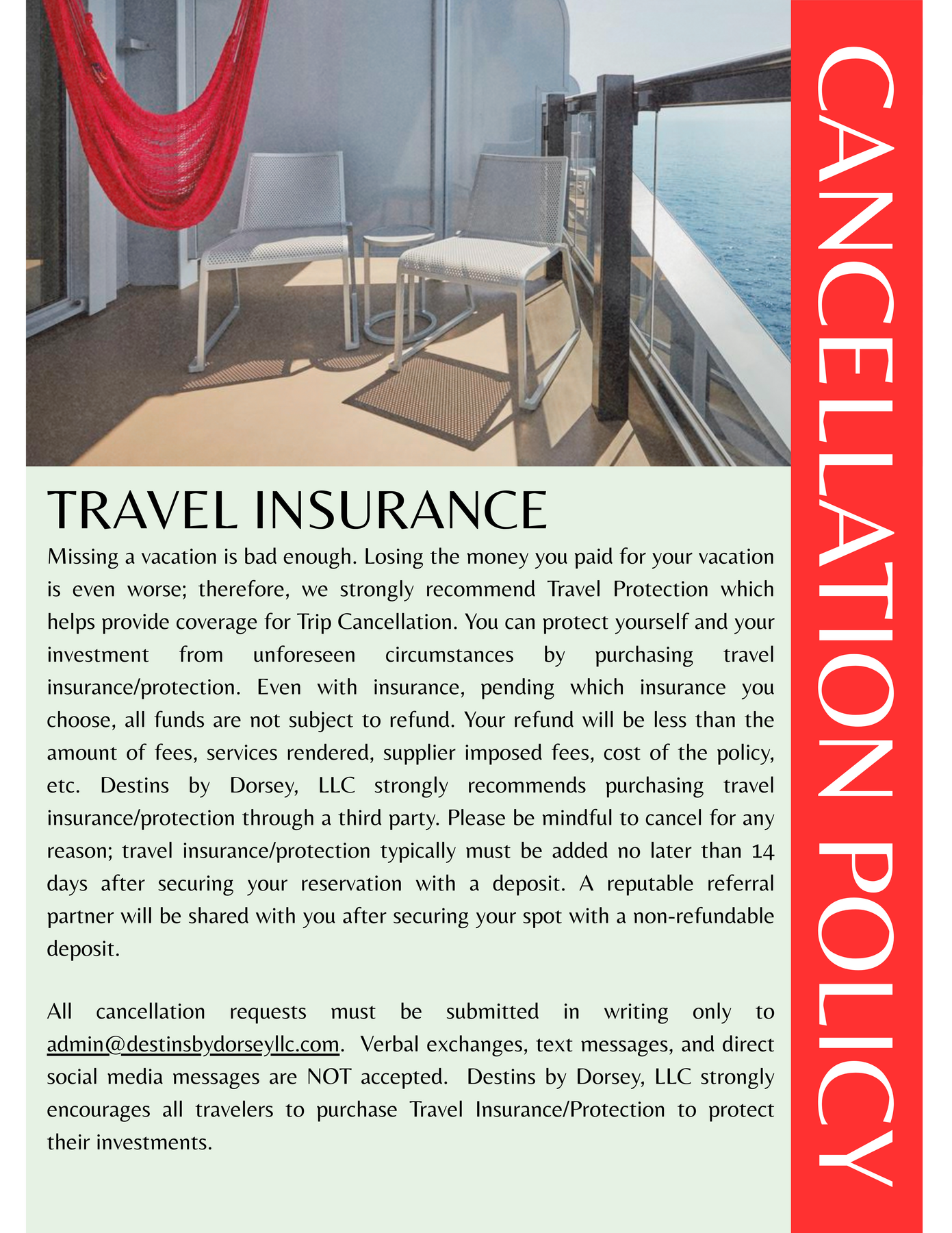 • Destins by Dorsey, LLC and its partners do not issue refunds and packages are non-transferable.