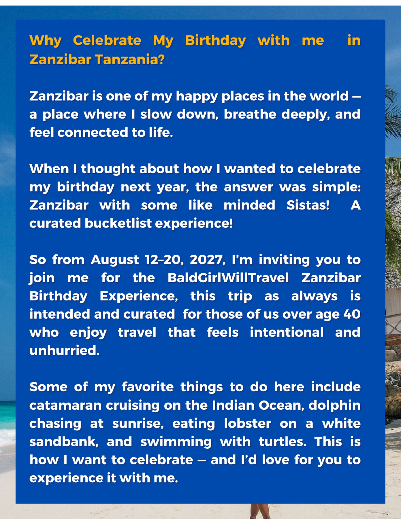 The BaldGirlWillTravel Zanzibar Birthday Experience is a small, affordable luxe group trip curated and created specifically for Black women over 40 who want to travel with intention, celebrate life, and experience Zanzibar with ease, beauty, and joy.