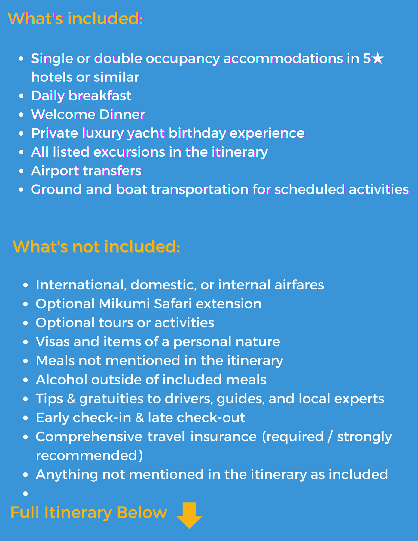 ✅ All excursions, activities, and experiences listed in the itinerary, including: