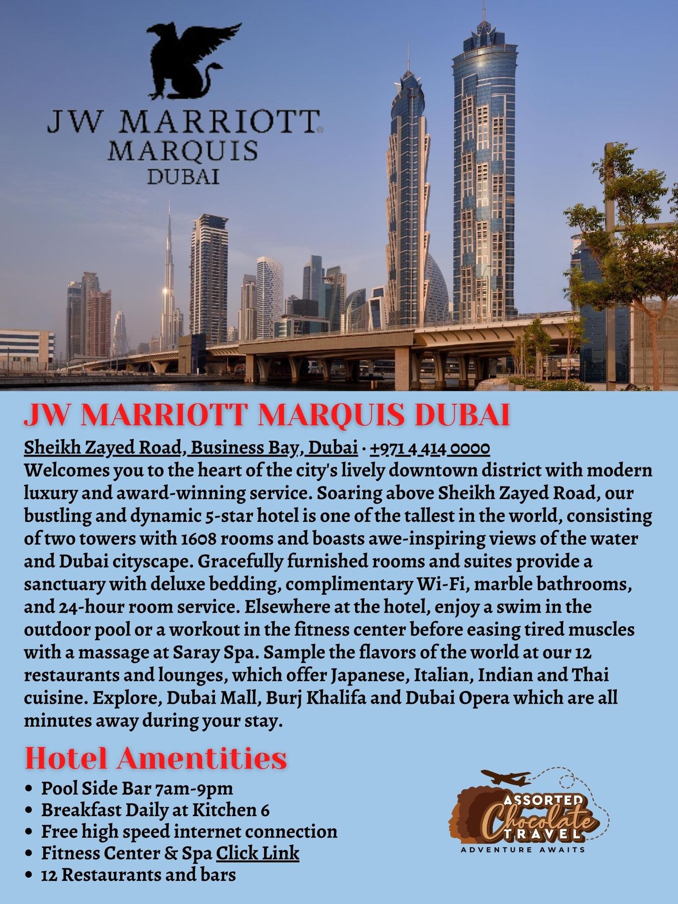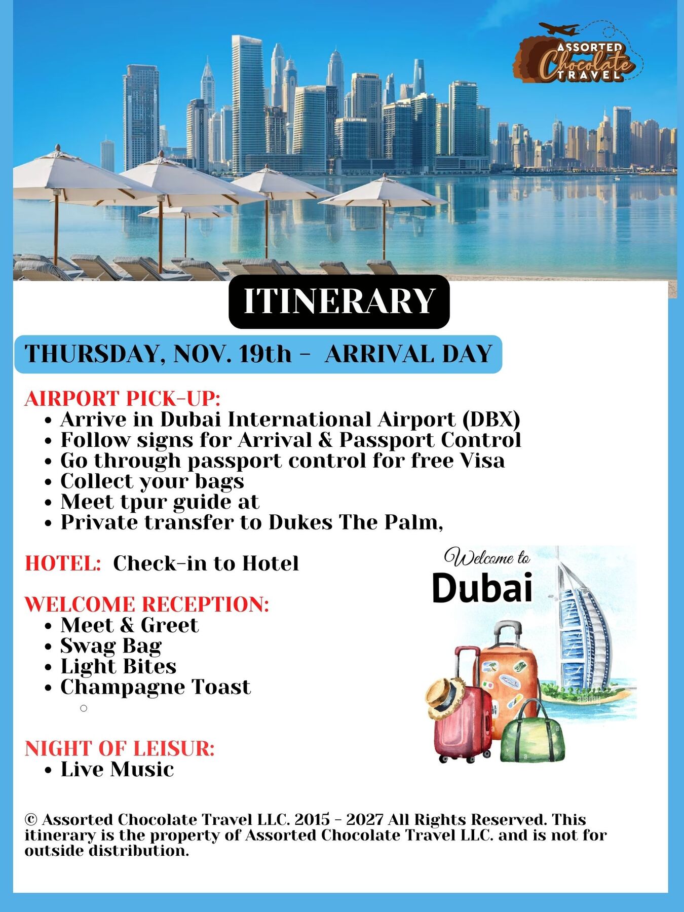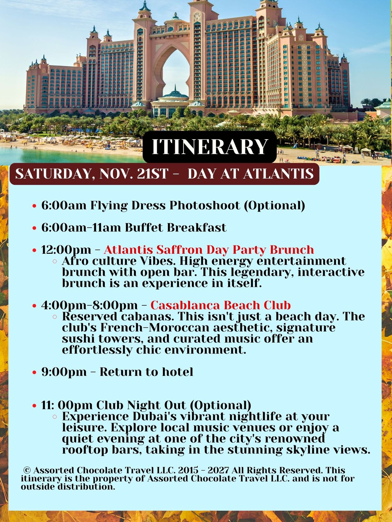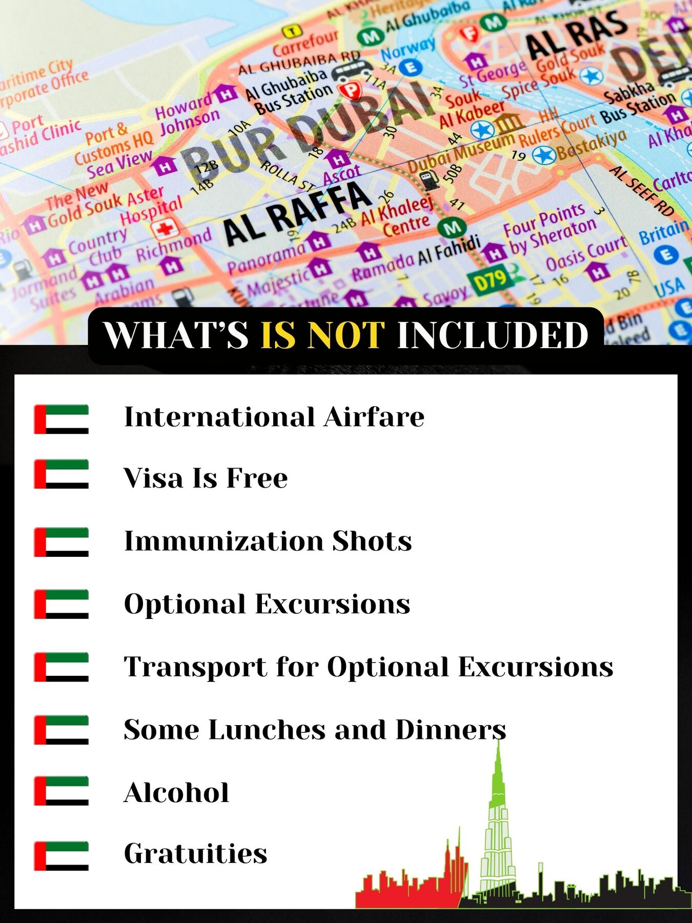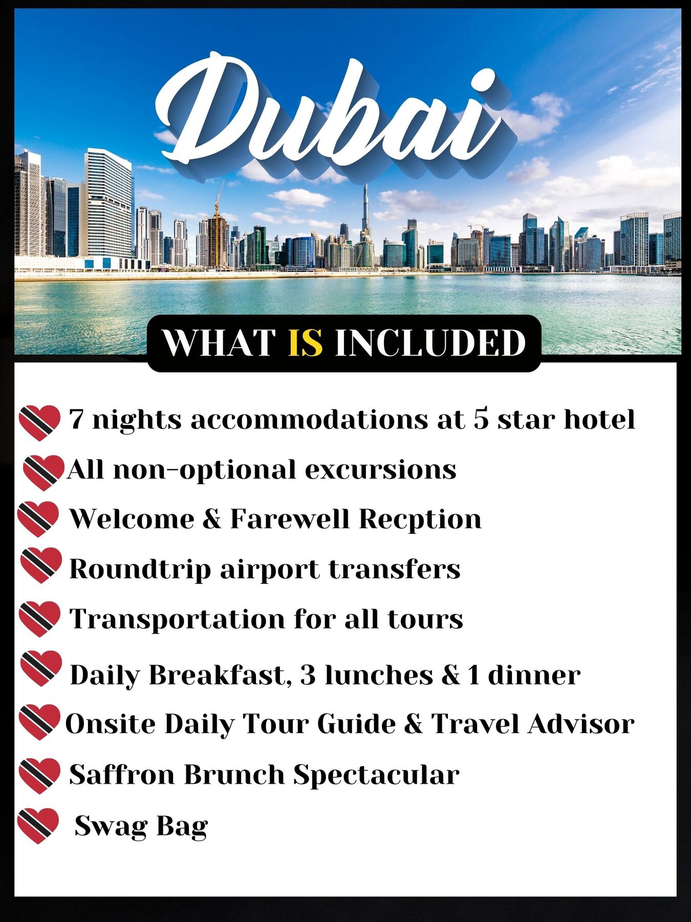 Your package includes 7-night accommodation at a 5-star hotel with free breakfast buffet daily. This hotel welcomes you to the beach front with modern luxury and award-winning service. This hotel is host to an inspiring collection of more than 5 award-winning restaurants, bars and lounges. This hotel provides the ideal luxury accommodation, along with the perfect location for experiencing Dubai. This package also includes all excursions not shown as optional., roundtrip airport transportation, daily breakfast buffet, 3 lunches, 1 dinner, onsite travel advisor, English-speaking tour guides, swag bag, welcome reception and farewell reception.