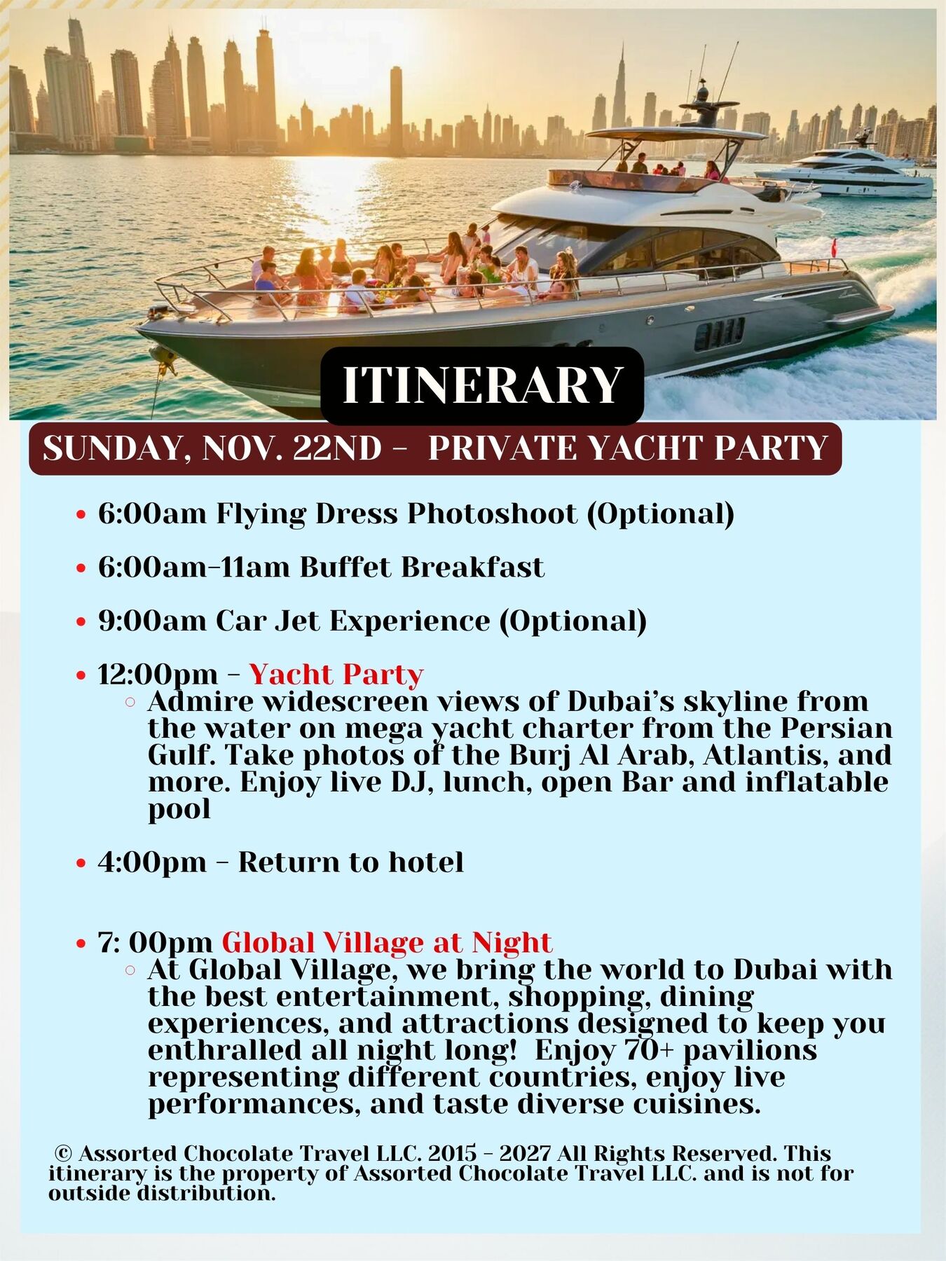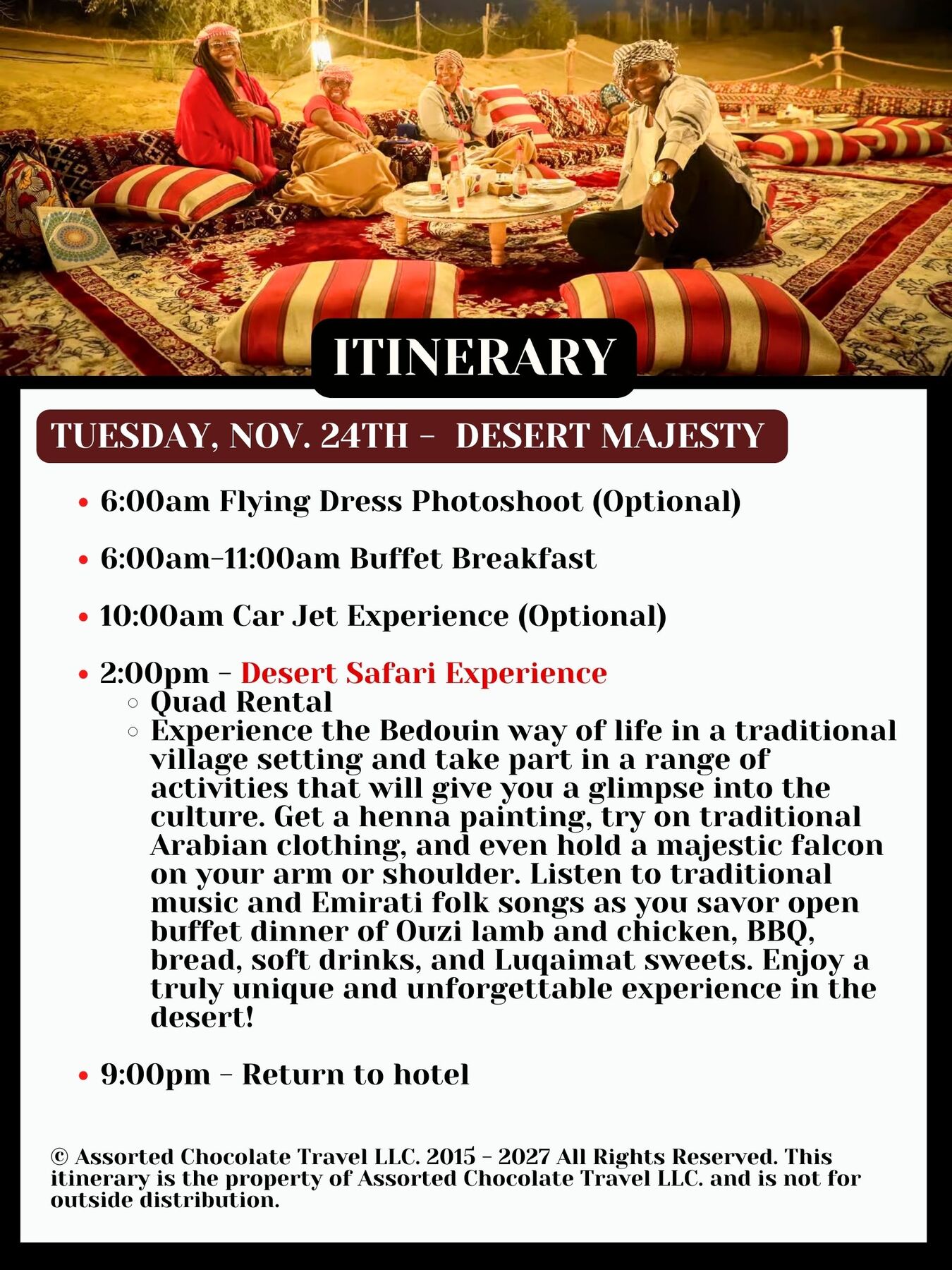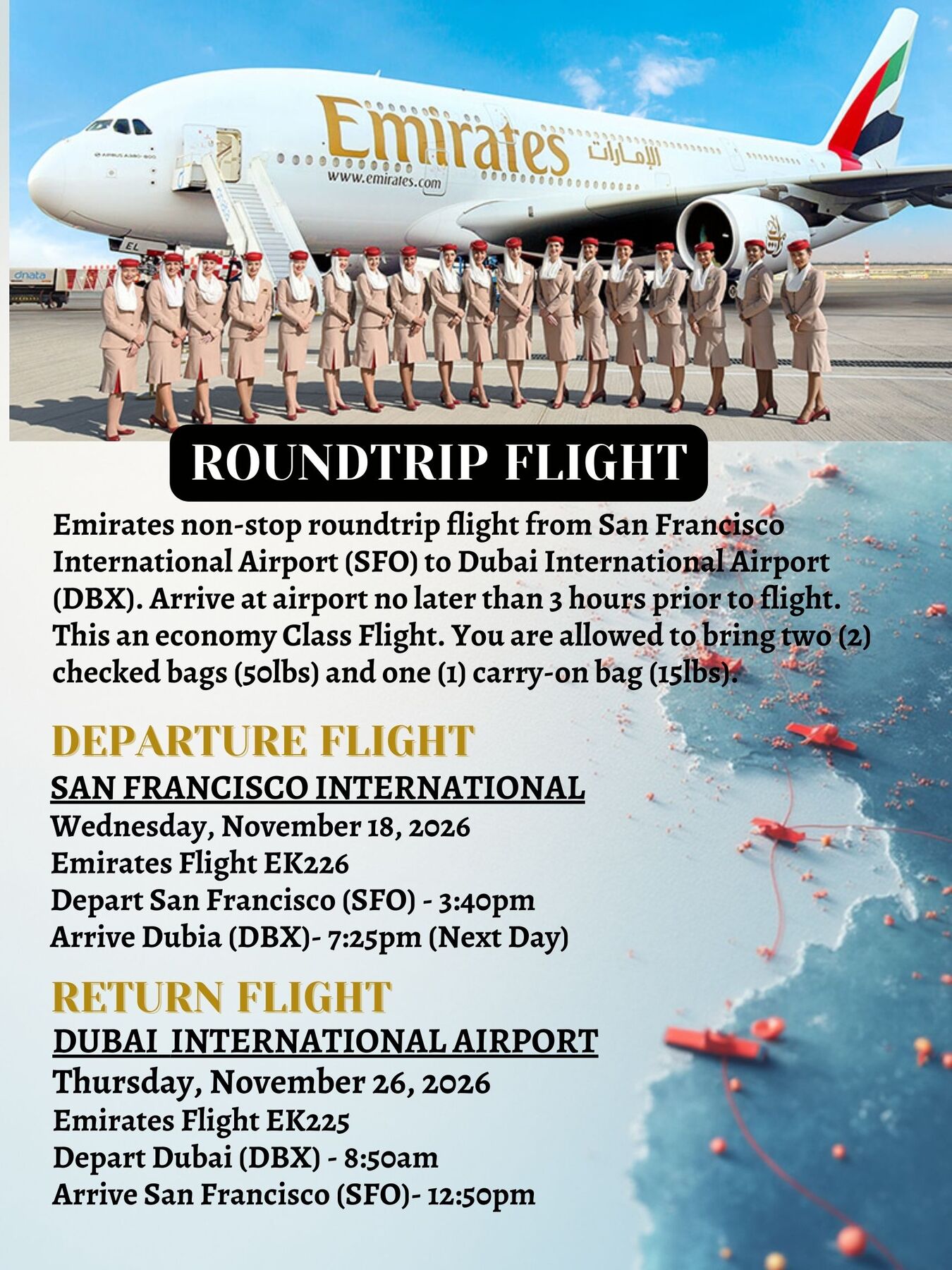 NON-STOP EMIRATES FLIGHT FROM SAN FRANCISCO TO DUBAI LEAVING NOVEMBER 18, 2026 AND RETURNING NOVEMBER 26, 2026 (THANKSGIVING DAY)