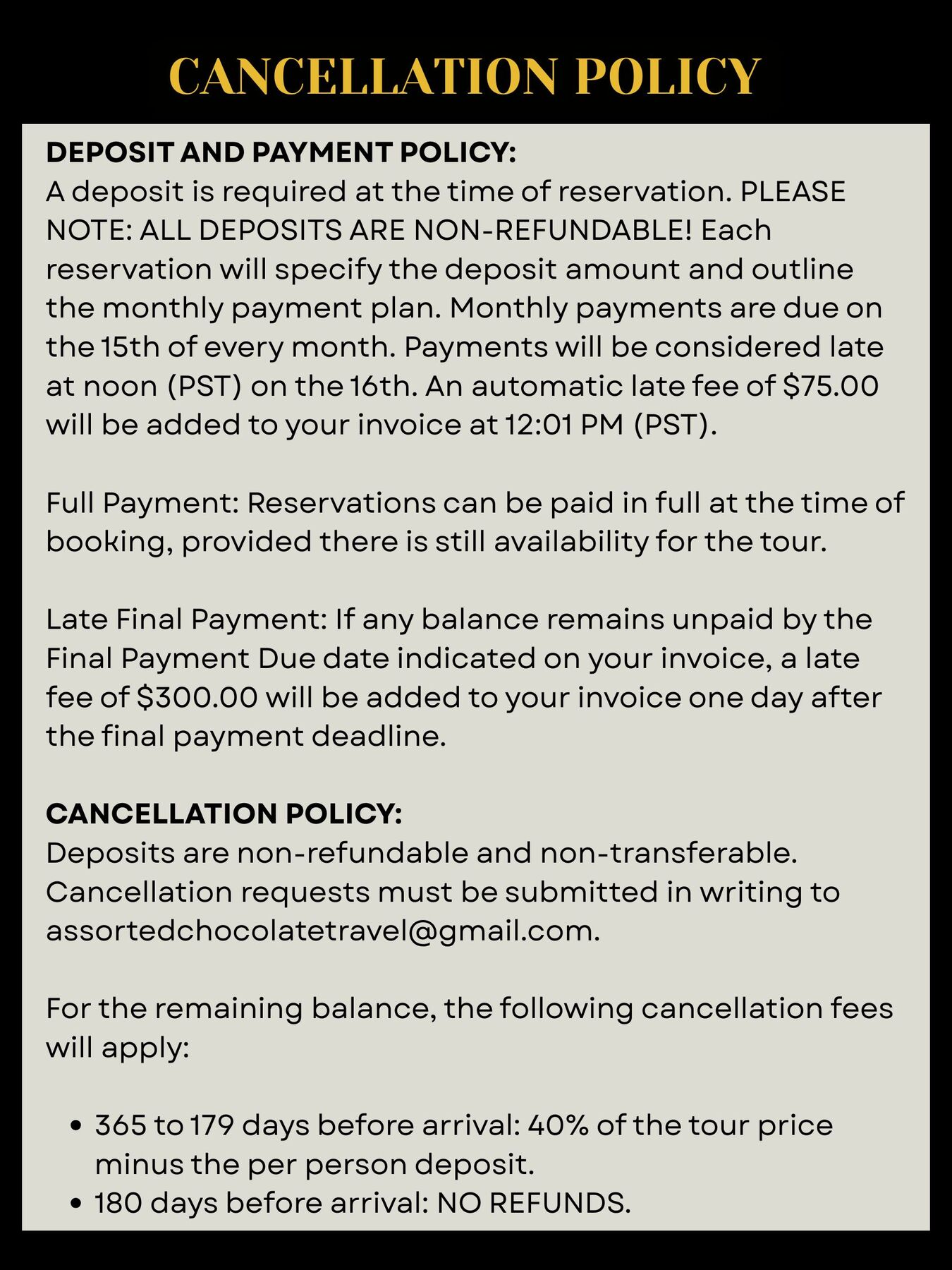 Late Final Payment: If there is any outstanding balance by the Final Payment Due date listed on your invoice, a late fee of $75 will automatically be added to your invoice one day after your final payment date.