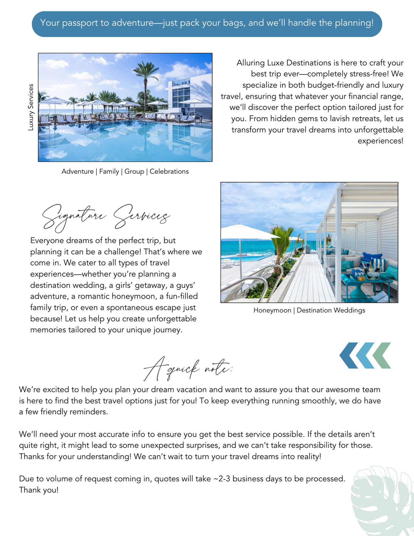 This includes tailored services to enhance your travel experience. It features a personalized travel plan day to day digital flyer, aligned with your preferences, along with recommendations and bookings for accommodations and transportation options like flights and car rentals. You'll also receive a curated list of must-see activities, dining recommendations, and valuable travel tips on local customs. The plan allows for flexibility with alternative options and includes ongoing support throughout your trip, ensuring a seamless and enjoyable experience! This fee is not per person, it covers all travelers.