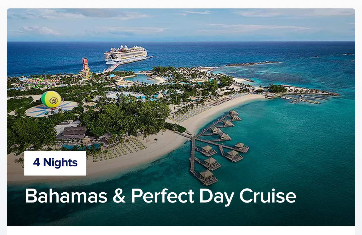 This 4-night Bahamian cruise kicks off your adventure on Day 1 as you set sail from Orlando (Port Canaveral), Florida, where excitement fills the air and the ship comes alive with entertainment, dining, and ocean views. Day 2 takes you to the vibrant shores of Nassau, Bahamas, where you can explore rich island culture, shop local markets, or relax on white-sand beaches. On Day 3, experience the ultimate beach day at Perfect Day at CocoCay, Royal Caribbean's private island paradise filled with thrill and chill -- from towering waterslides and massive freshwater pool to overwater cabanas and serene beach vibes. Finally, Day 4 is all yours to enjoy at sea -- unwind at the spa, savor world-class cuisine, or dive into nonstop onboard fun as you cruise back to Florida with memories to last a lifetime.