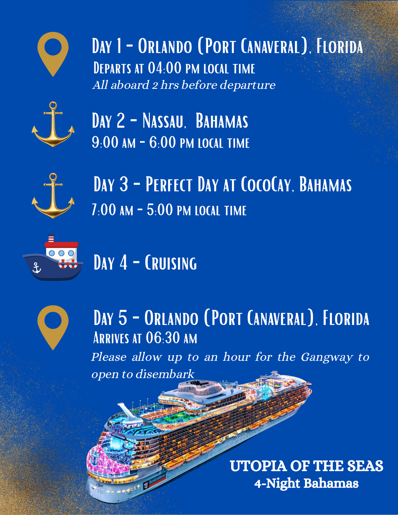 Set sail on a spectacular 4-night adventure aboard the Royal Caribbean Utopia of the Seas for a Bahamian cruise--the ultimate vacation getaway packed with nonstop fun, unforgettable view, and luxurious vibes. The newest and boldest ship in the fleet--where every moment is designed to wow you!