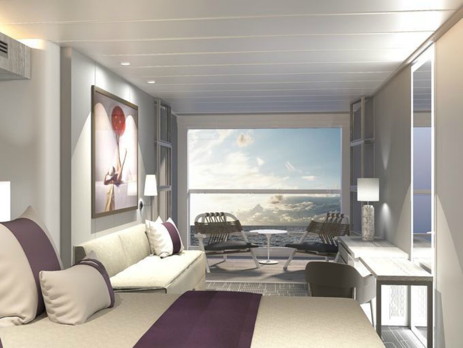All staterooms come complete with a private bathroom, vanity area, interactive TV, safe, phone, and hairdryer. Veranda staterooms feature: Private veranda that opens up to outdoor seating; Floor-to-ceiling windows and glass doors; King-sized CashmereTM Mattress & eXhale® bedding. Floor-to-ceiling porthole view with a private veranda. Centrally located for easy access to all decks. A limited number of staterooms have this unique view. New Cashmere CollectionSMluxury king-sized mattress. Two lower double beds are convertible to King (except as noted). Some staterooms may have a trundle bed. Dual voltage 110/220 AC. Plentiful storage space in your bathroom and wardrobe. Smart TV, individual safe, and mini-fridge*. *Additional charges apply