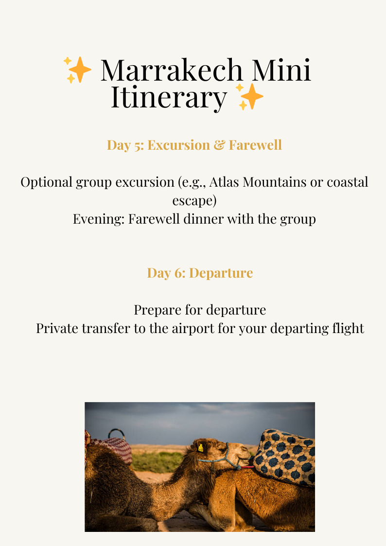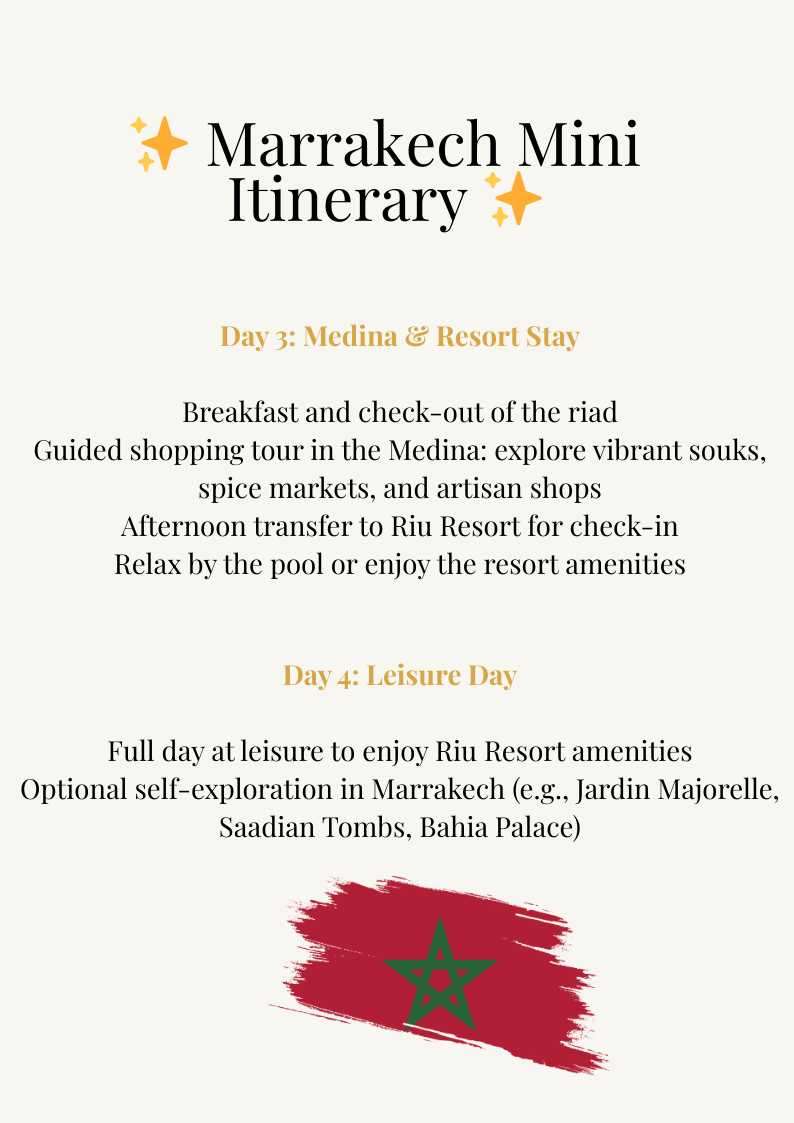 🌙 Accommodations: Split your stay between a traditional Riad for authentic Moroccan charm and the beautiful Riu Palace Tikida Agadir for all-inclusive resort luxury.