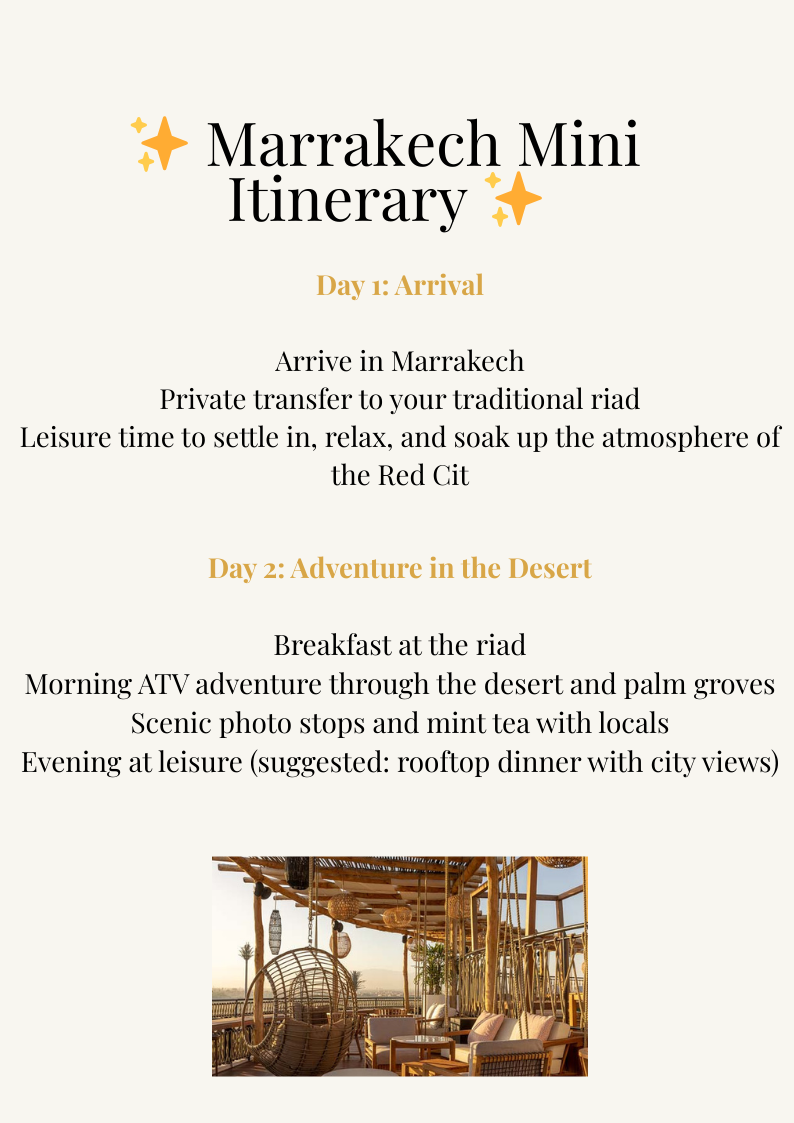 ✨ Start your Moroccan journey in a traditional Riad. Immerse yourself in rich culture, indulge in soothing spas, savor authentic cuisine, and sip cocktails at stunning rooftop bars. 🌙🍷✨