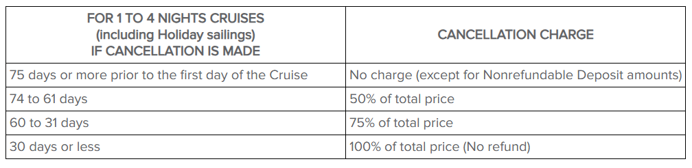Cruises that are cancelled prior to the sail date, and CruiseTours that are cancelled prior to the first day of the CruiseTour, may be subject to a cancellation charge. The amount of the cancellation charge shall be determined as shown in the table below and shall vary depending on how far in advance of the sail date (or first day of the CruiseTour) the Operator receives notice of cancellation.