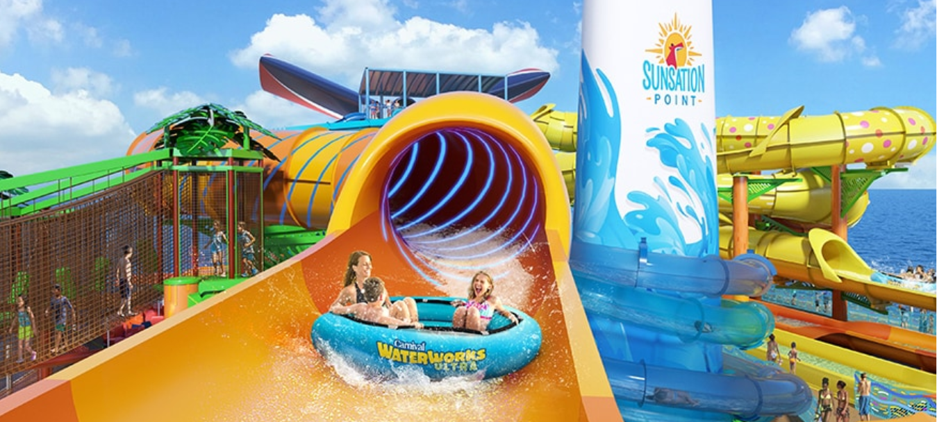 Sunsation Point's splashing, glistening jewel of fun under the sun is Carnival WaterWorks Ultra. Yes to brag, but this is the most family-friendly waterpark at sea, and Carnival's biggest yet! Designed to deliver the H, the 2 and the O to all guests, this one is packing six thrilling waterslides, plus a splash pad designed just for babies... with another pad for everyone. If you love waterslides, here's what you need to know: we're talking a pair of family raft rides (Turning Tides and SunSoaker), two sets of racing slides (Racing Currents and Mini Racers), one twisty kids' slide (Mini Twister), and one splashtacular spiral slide for everyone. What's the speed limit here? That's between you and physics!