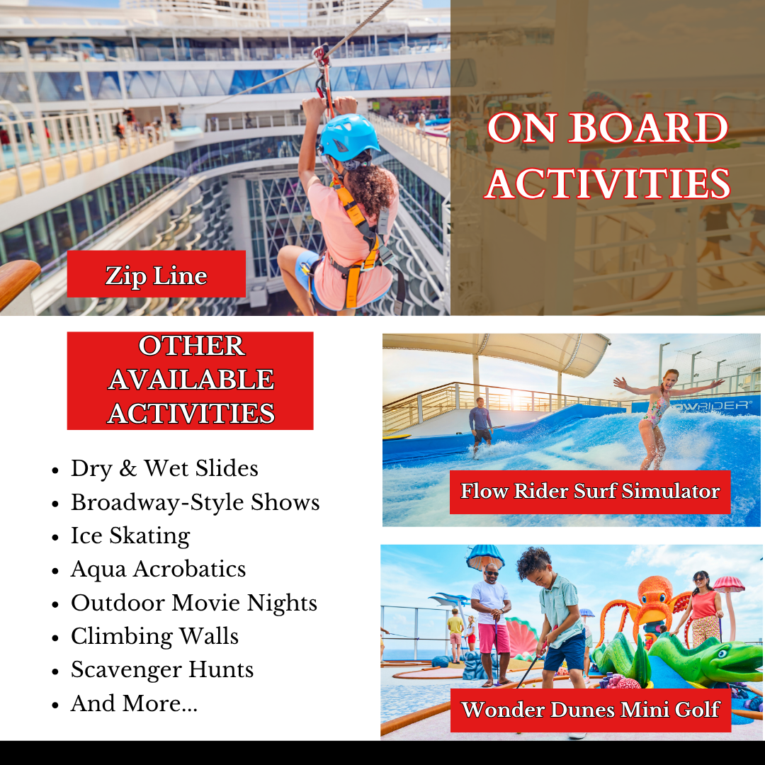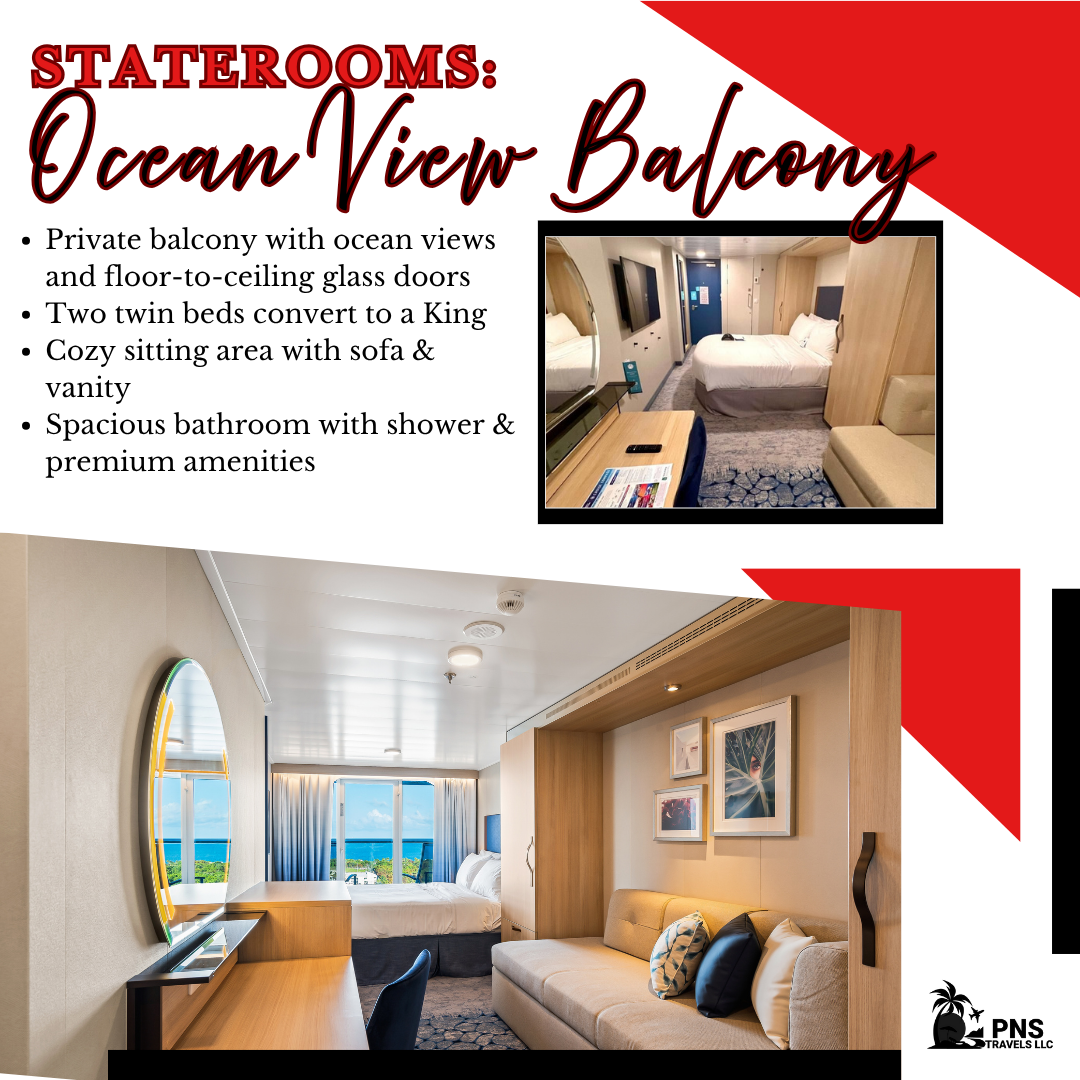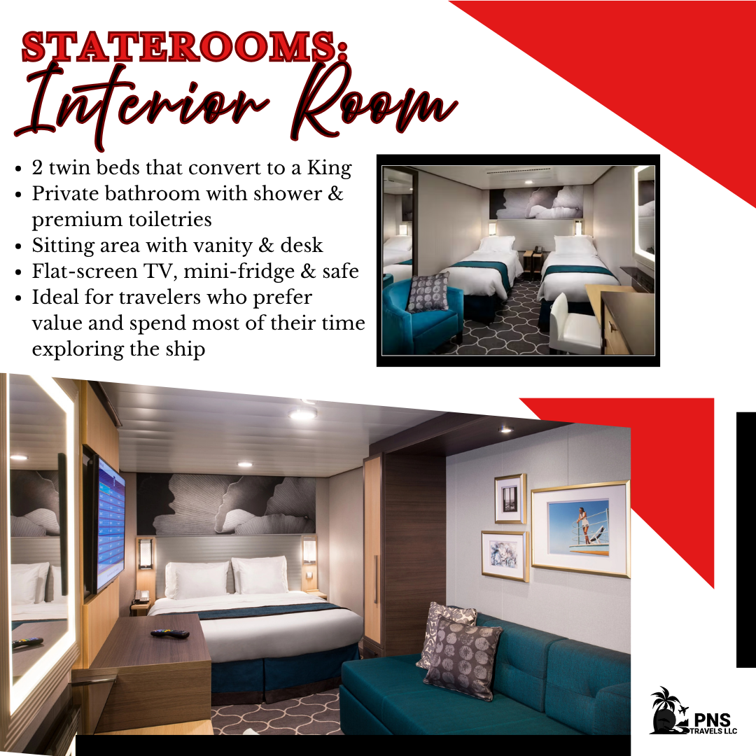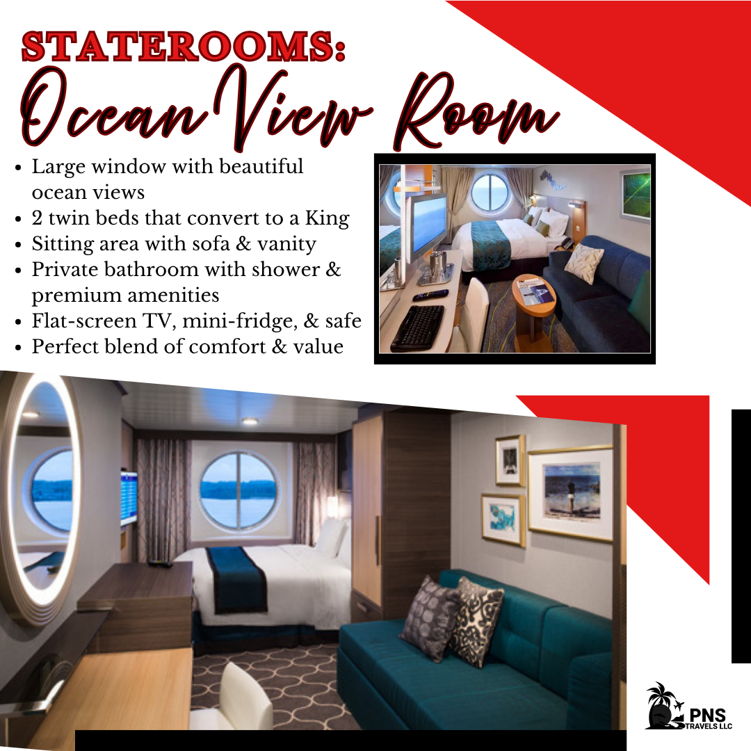 Inside, you’ll enjoy two twin beds that convert to a Royal King, a comfortable sitting area with a sofa and vanity, and a private bathroom with a shower and premium toiletries. Additional conveniences include a flat-screen TV, mini-fridge, safe, and ample storage.