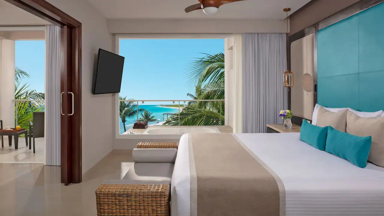 Take in views of the majestic Caribbean in this 700-square-foot suite, featuring a wide king bed, separate living area, balcony, and a bathroom featuring marble floors, a hot tub, a rain shower, and double sinks.