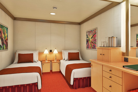 ==> Interior - Interior Staterooms have two twin beds that convert to a queen-sized bed, ample closet and storage space, a private bathroom with shower, and a living area with vanity and seating. Staterooms are equipped with thermostat-controlled air-conditioning, television, telephone, and personal safe.