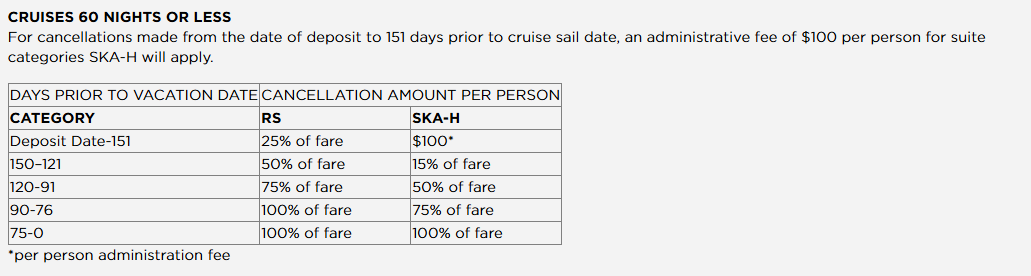 A 100% cancellation fee will be imposed as indicated for non-appearance. Fare is defined as the full cost of any cruise or air component purchased from Regent Seven Seas Cruises®, excluding optional facilities and services fees. Please refer to the full Terms and Conditions of the Guest Ticket Contract for fees relating to the cancellation of optional facilities and services. Any refund due as indicated by the cancellation fee schedule will be made after receipt of written notice of cancellation. Cancellation notices must be in writing and received by Regent Seven Seas Cruises® no later than the day before cancellation penalties are to be assessed. Guests who cancel within the indicated periods are subject to the following per person cancellation fees.