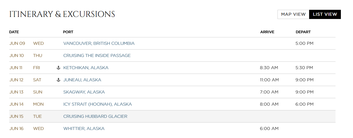 Cruise through glacier-carved fjords, witness wildlife in their natural habitat, and explore iconic Alaskan ports like Ketchikan, Juneau, Skagway, and Icy Strait Point—all while enjoying world-class dining, fine wines, and personalized service.